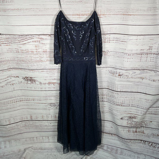 Clothing > Women's Clothing > DressesNWT Tadashi Shoji Bridal Silana Off Shoulder Navy Blue Sequin Gown Dress sz 4