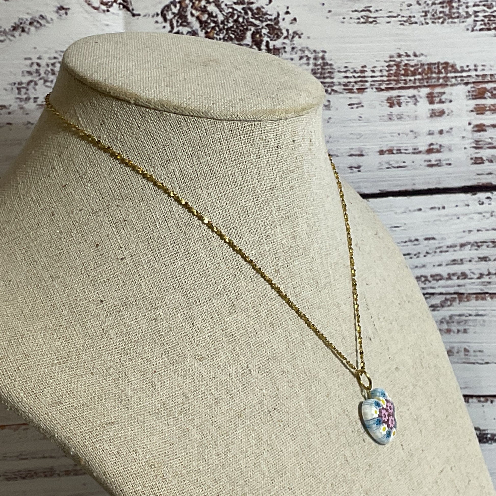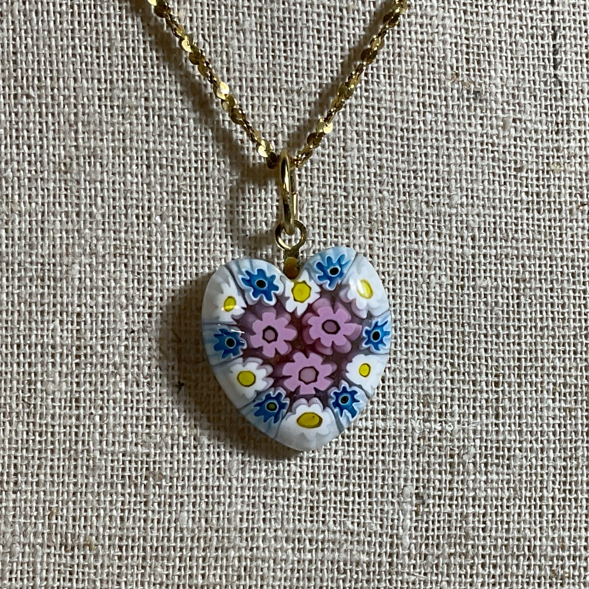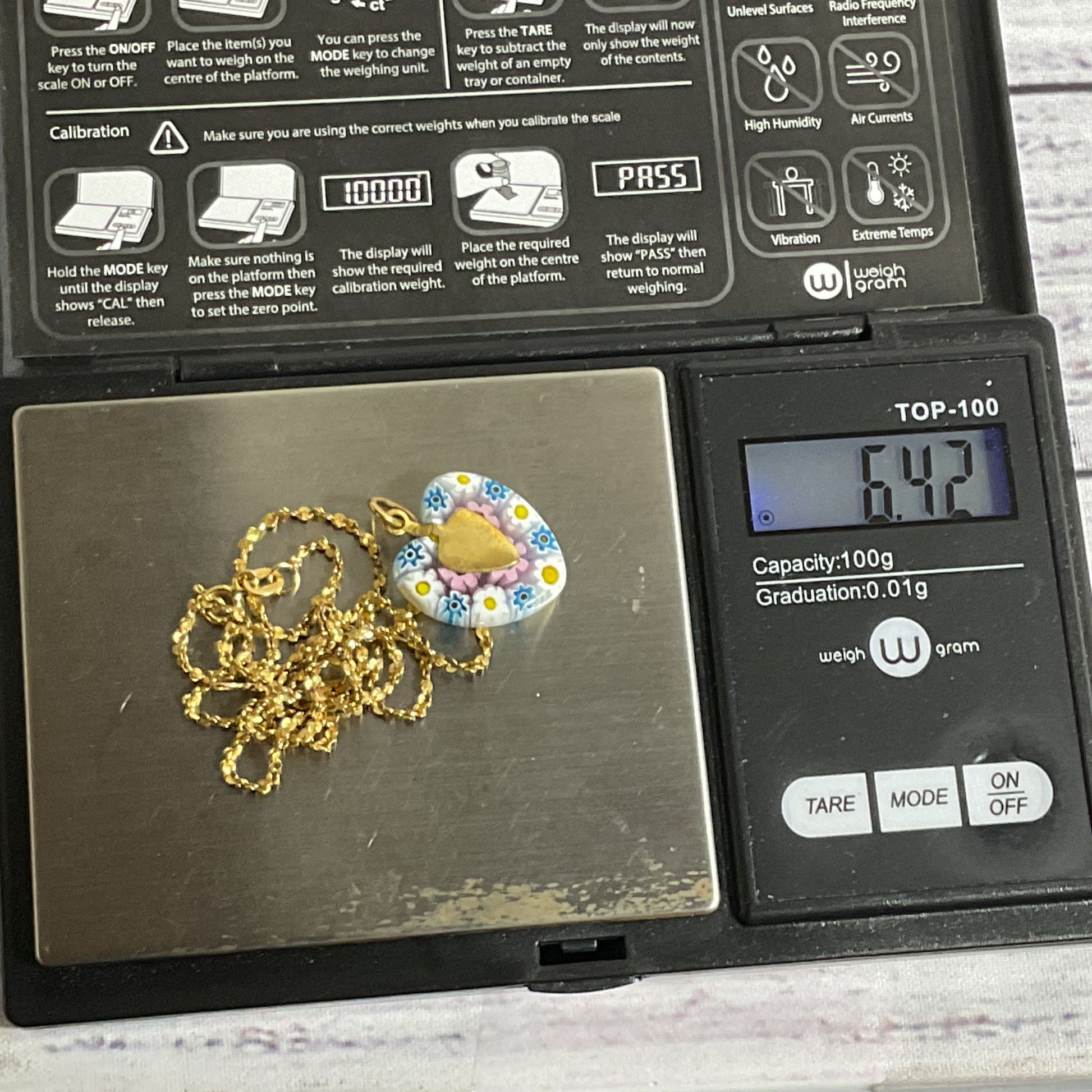 14K Yellow Gold & Millefiori Heart Pendant 16" Chain Necklace- 6.42g