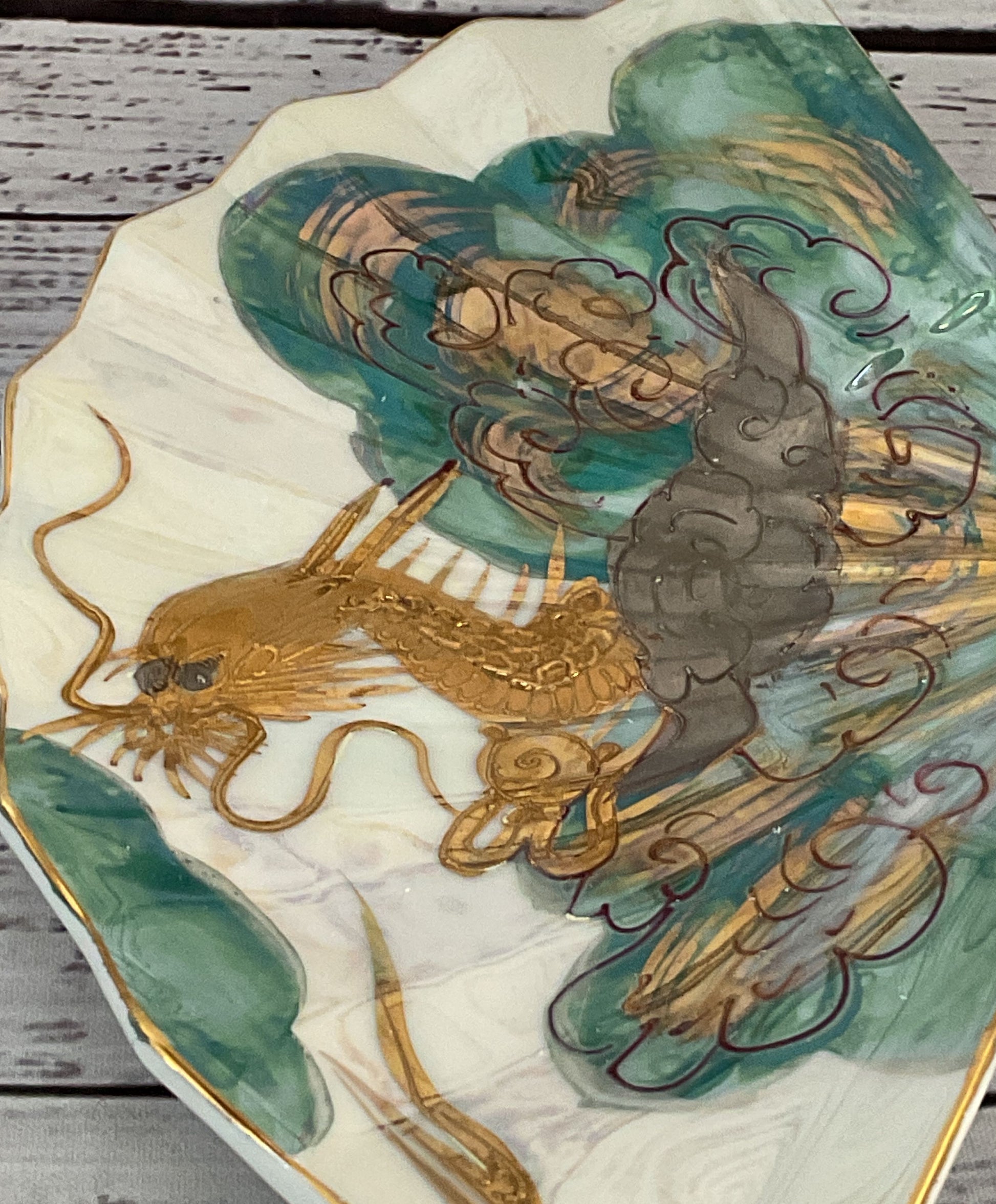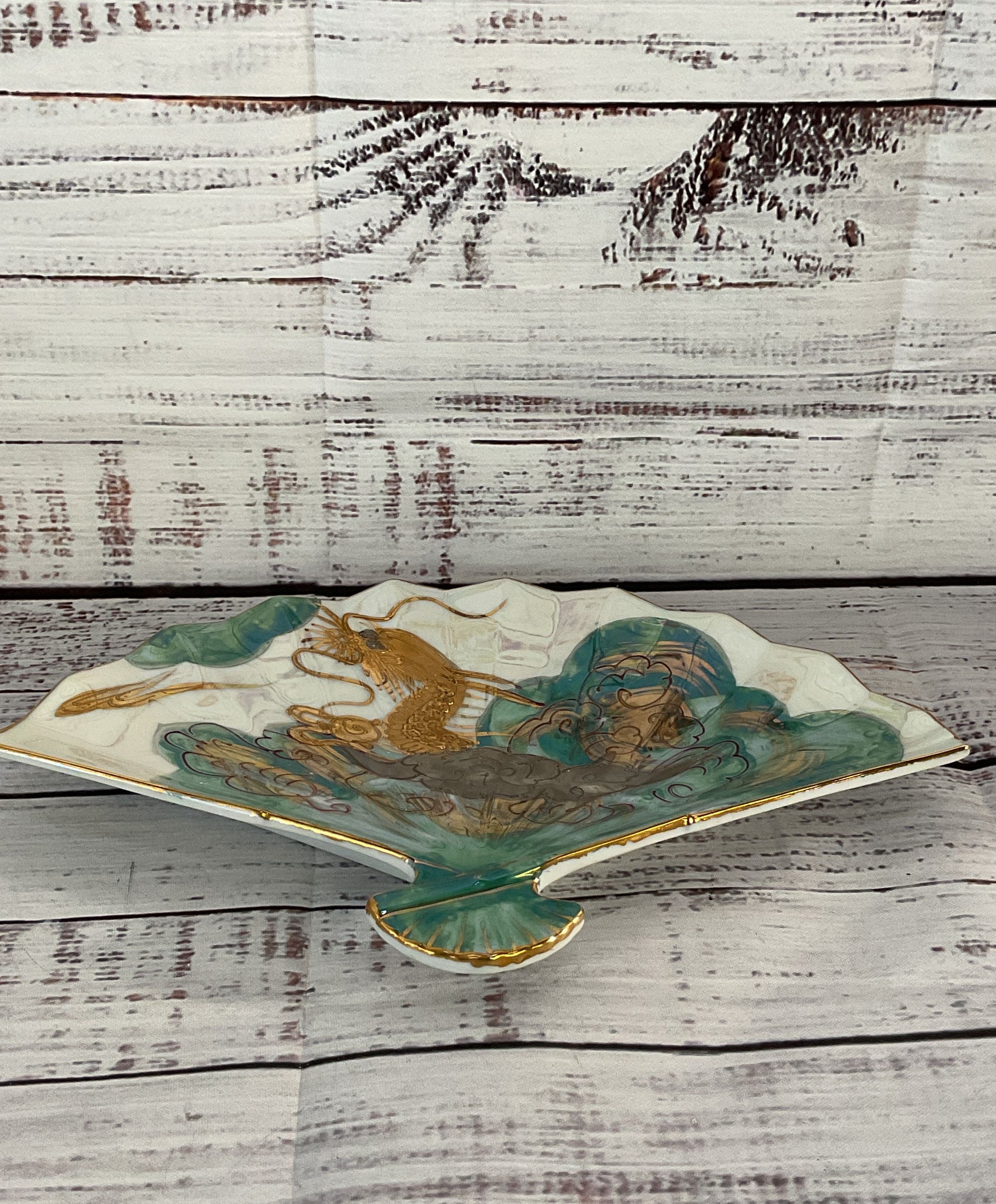 Aito Hand Painted 18K Gold Dragon Trinket Fan Dish Multicolor