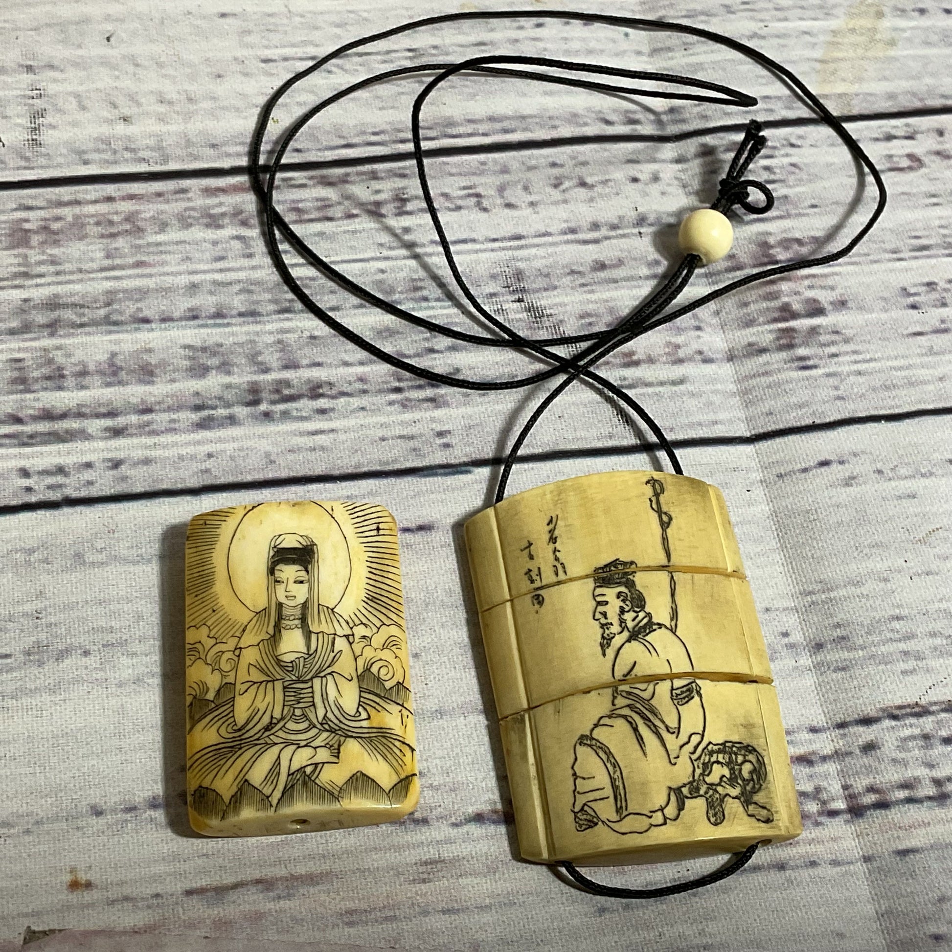 ANTIQUE Japanese Bone 3 Compartment Inro & "Save All Sentient Beings" Pendant