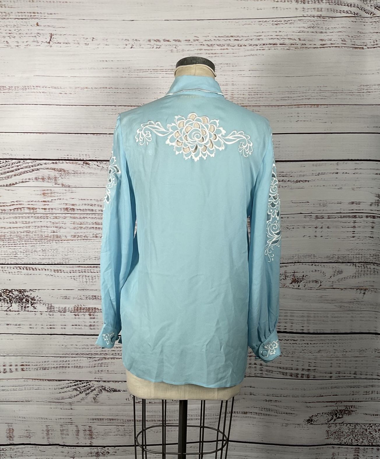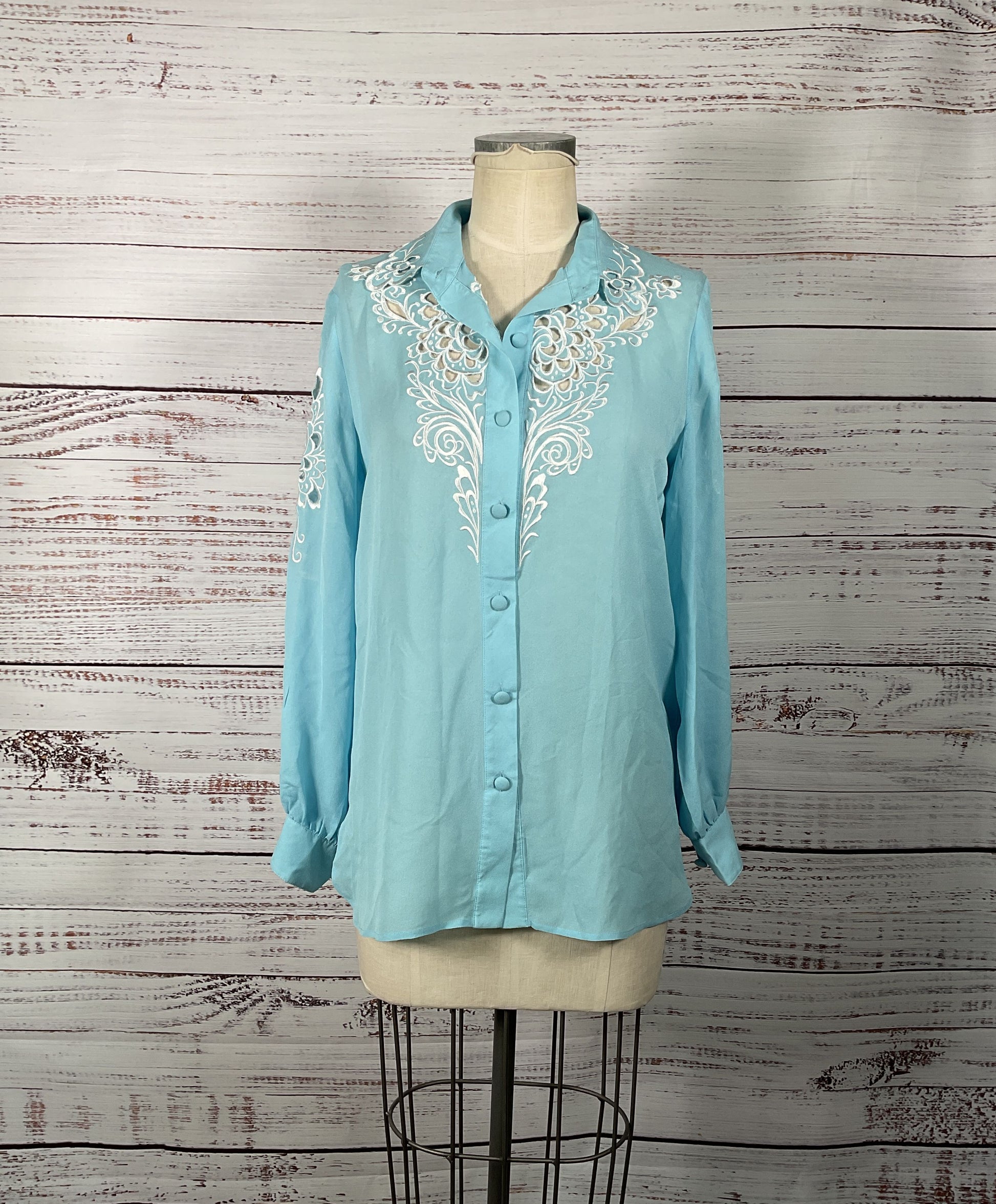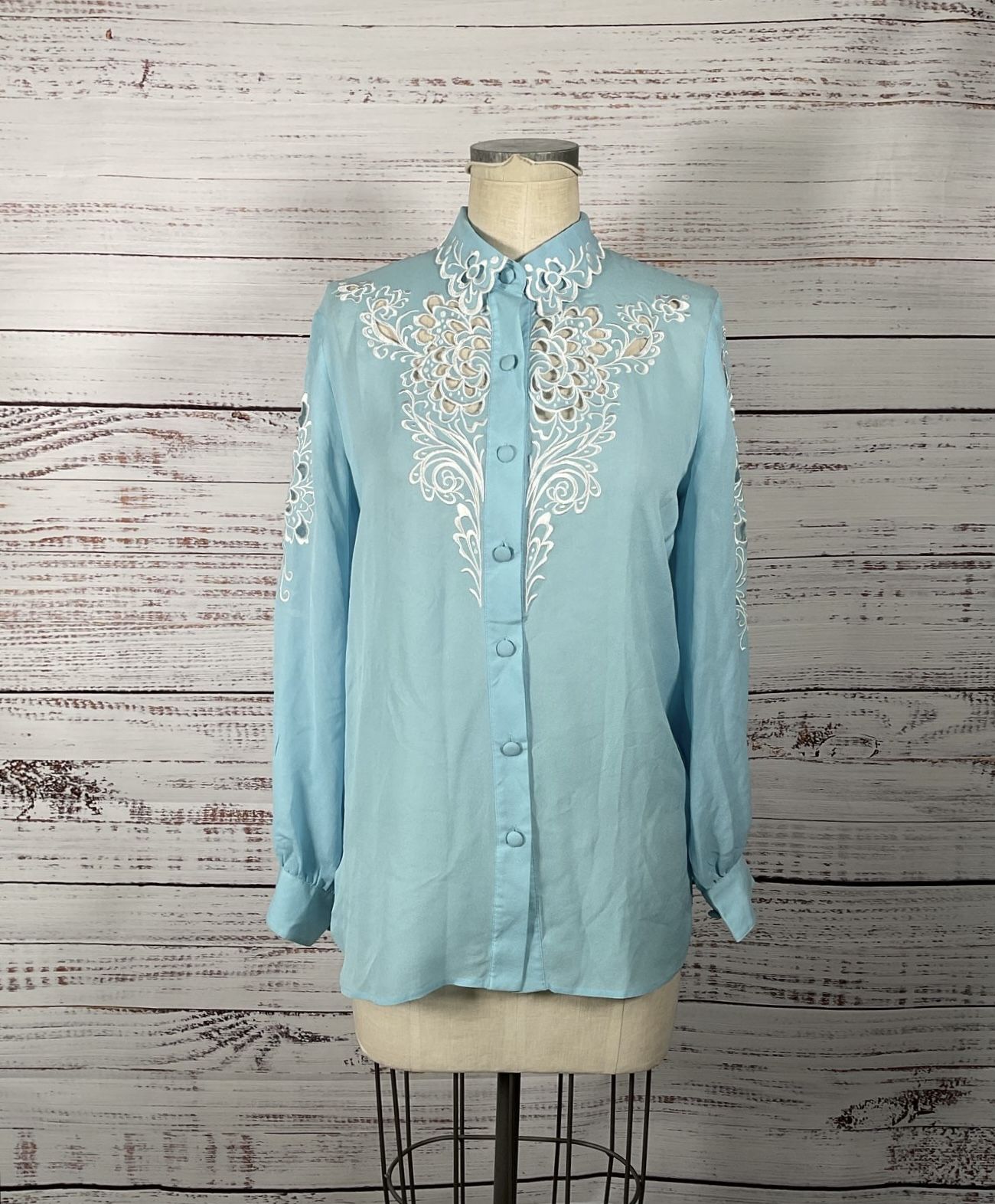 Bob Mackie Wearable Art 100% Silk Button-Up w/ Embroidery Applique and Cut-Outs
