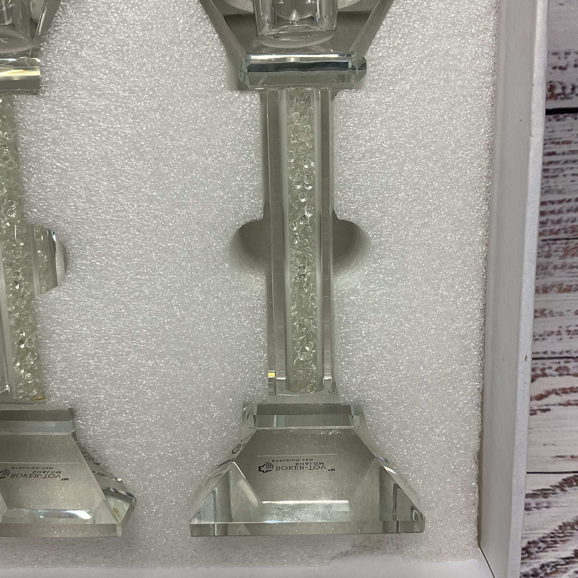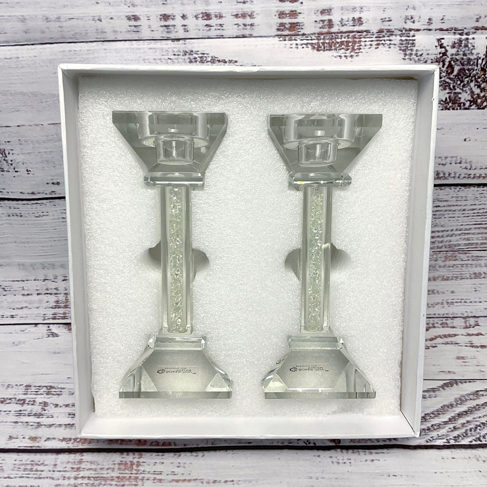 Boker Tov Shalom Rhinestone Crystal Glass Candle Stick Pair