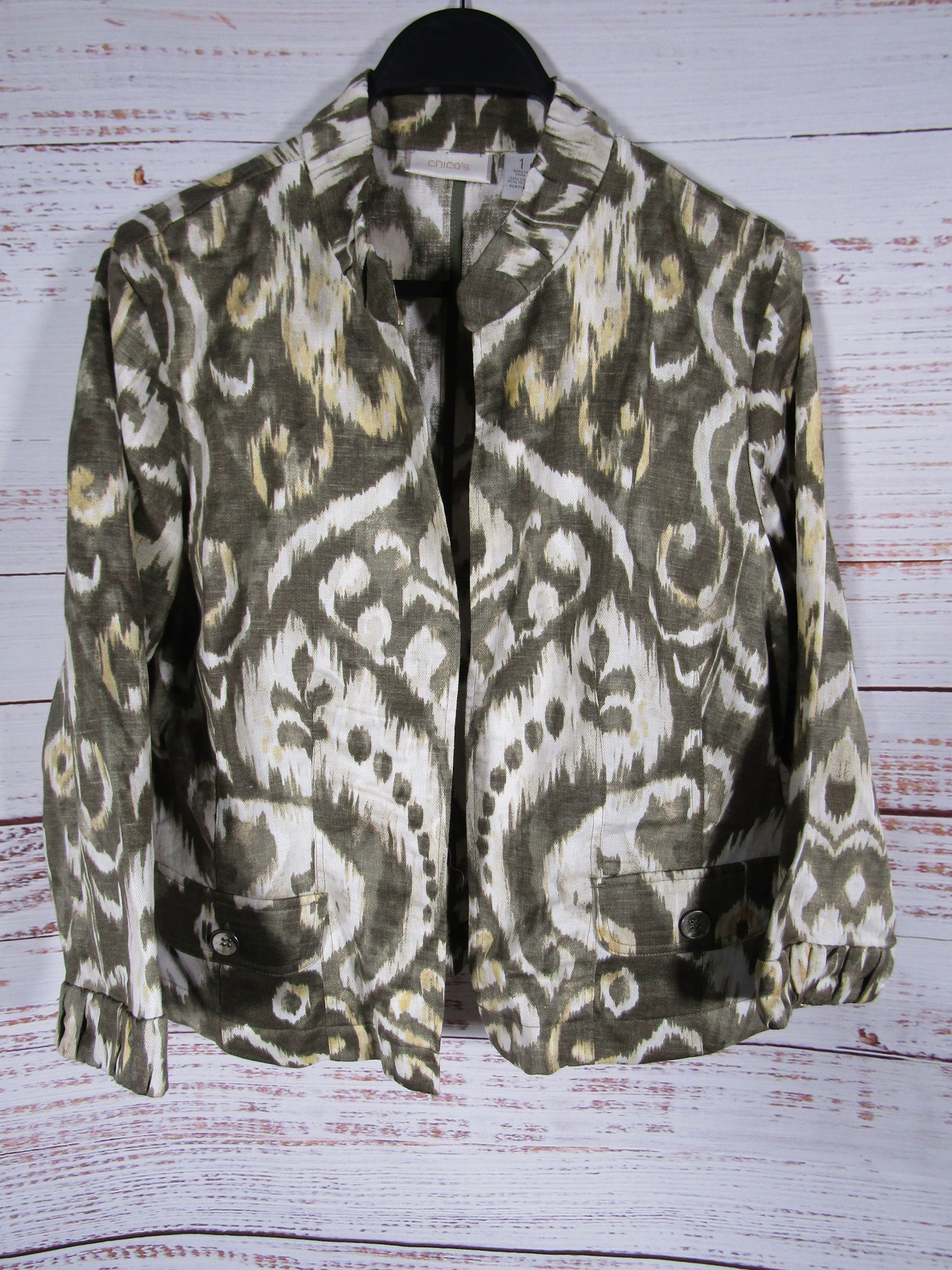 Chico's Ikat Women's Green Linen Blend Open Jacket Size 1