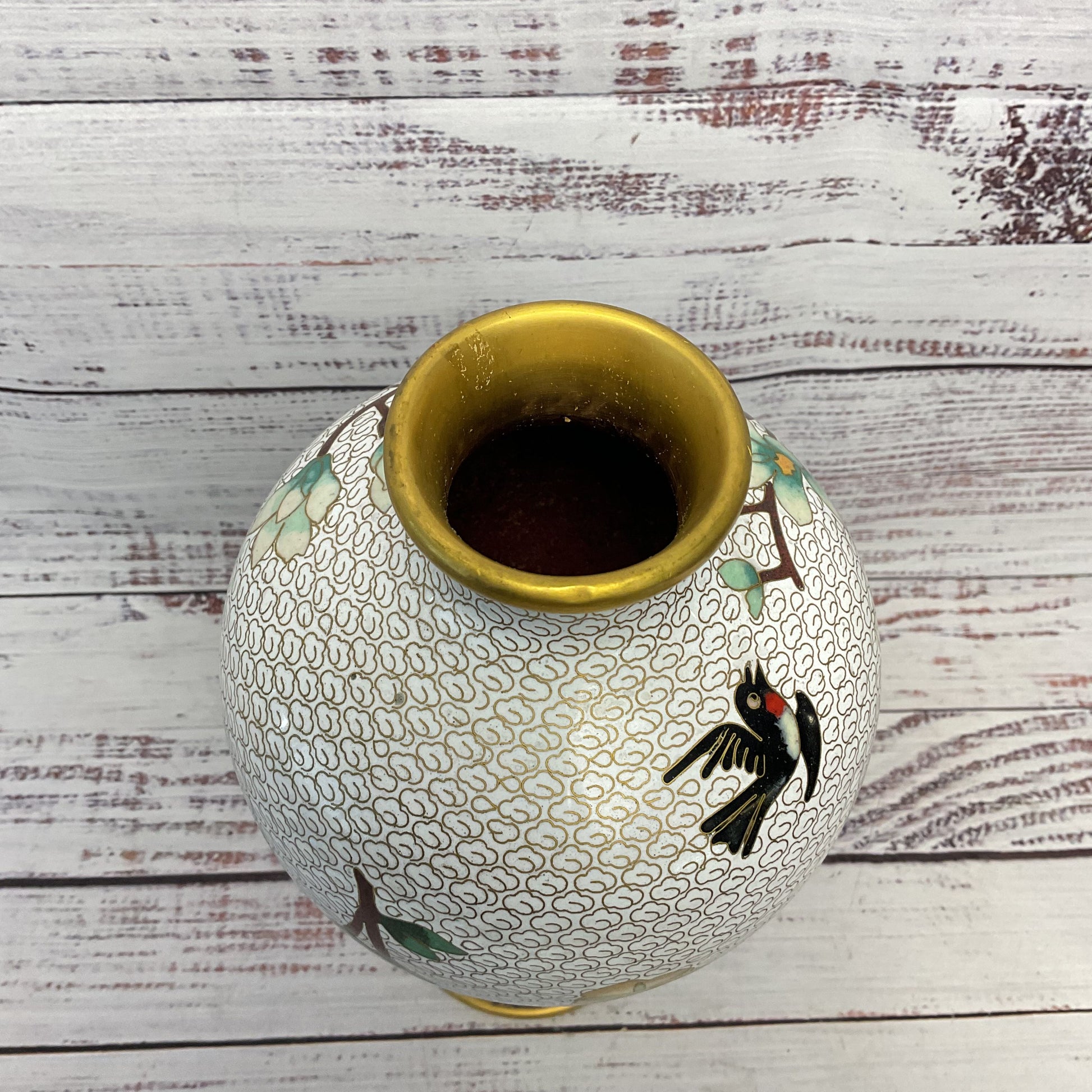 Cloisonne Floral Bird Design White Enamel Brass Vase 10.5"