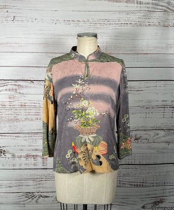 Cute Citron 100% Silk Mandarin Collar Eclectic Floral Long Sleeve-Size Medium