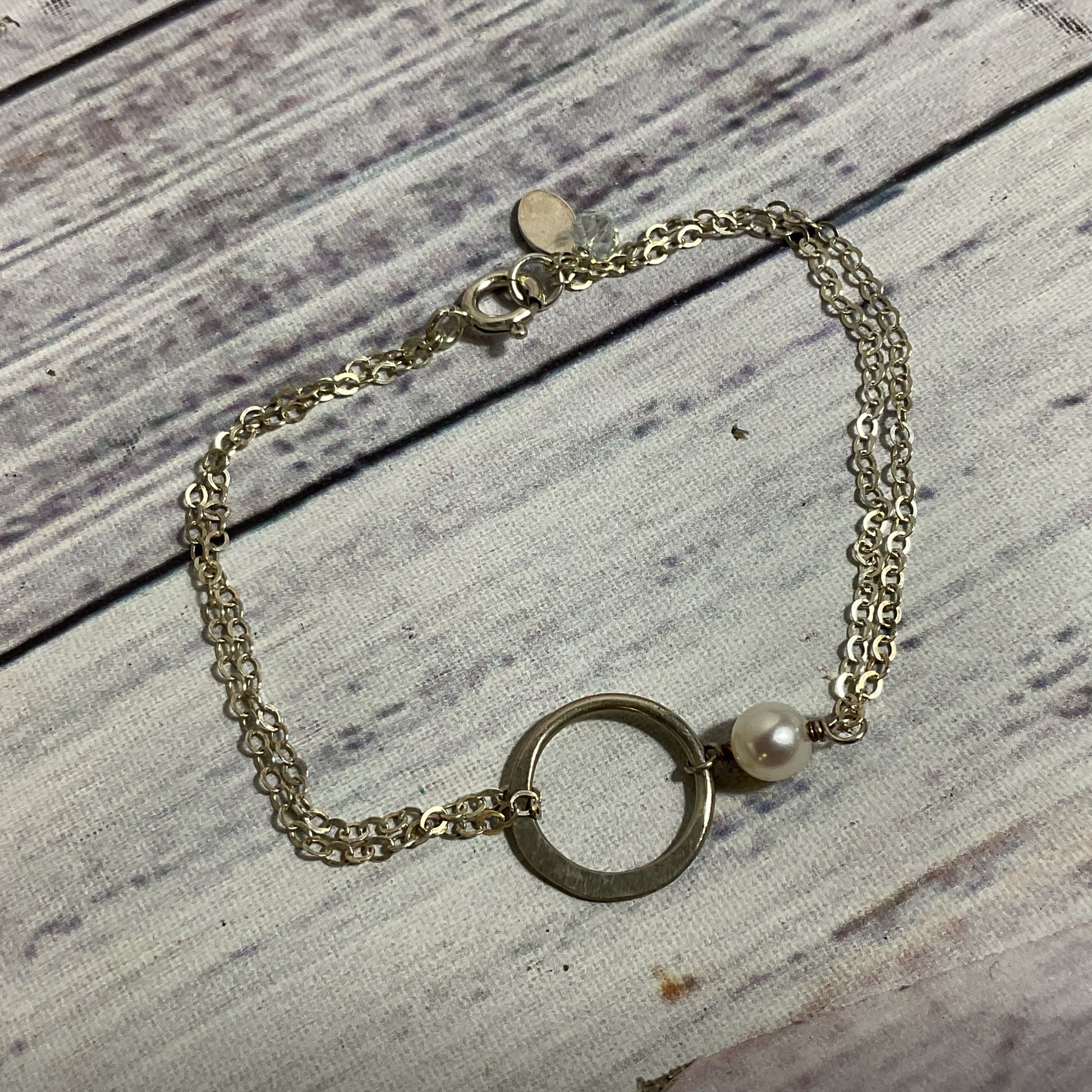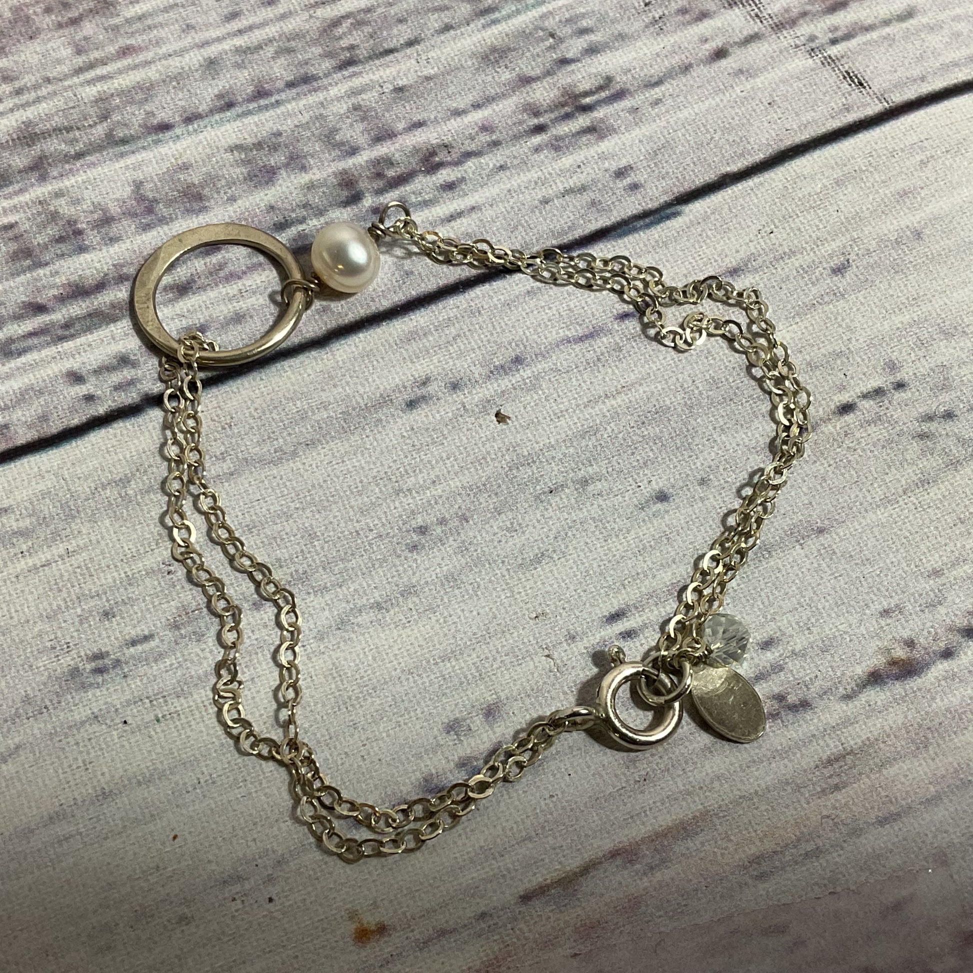 EFY Sterling Silver Faux Pearl and Rhinestone Double Chain 7" Bracelet- 2.26g
