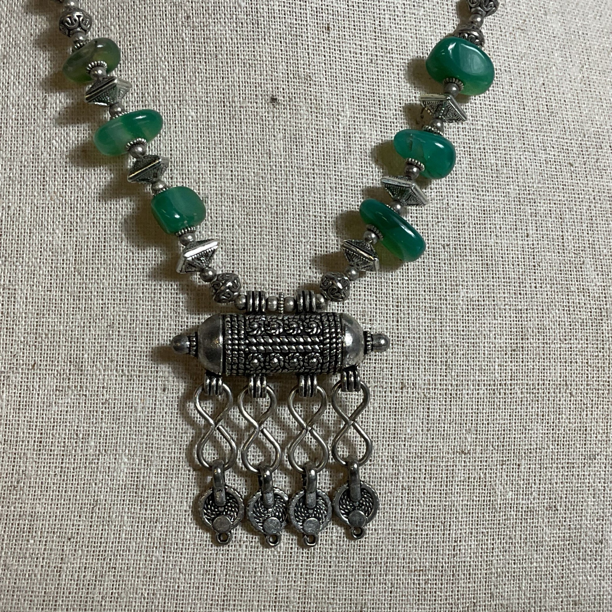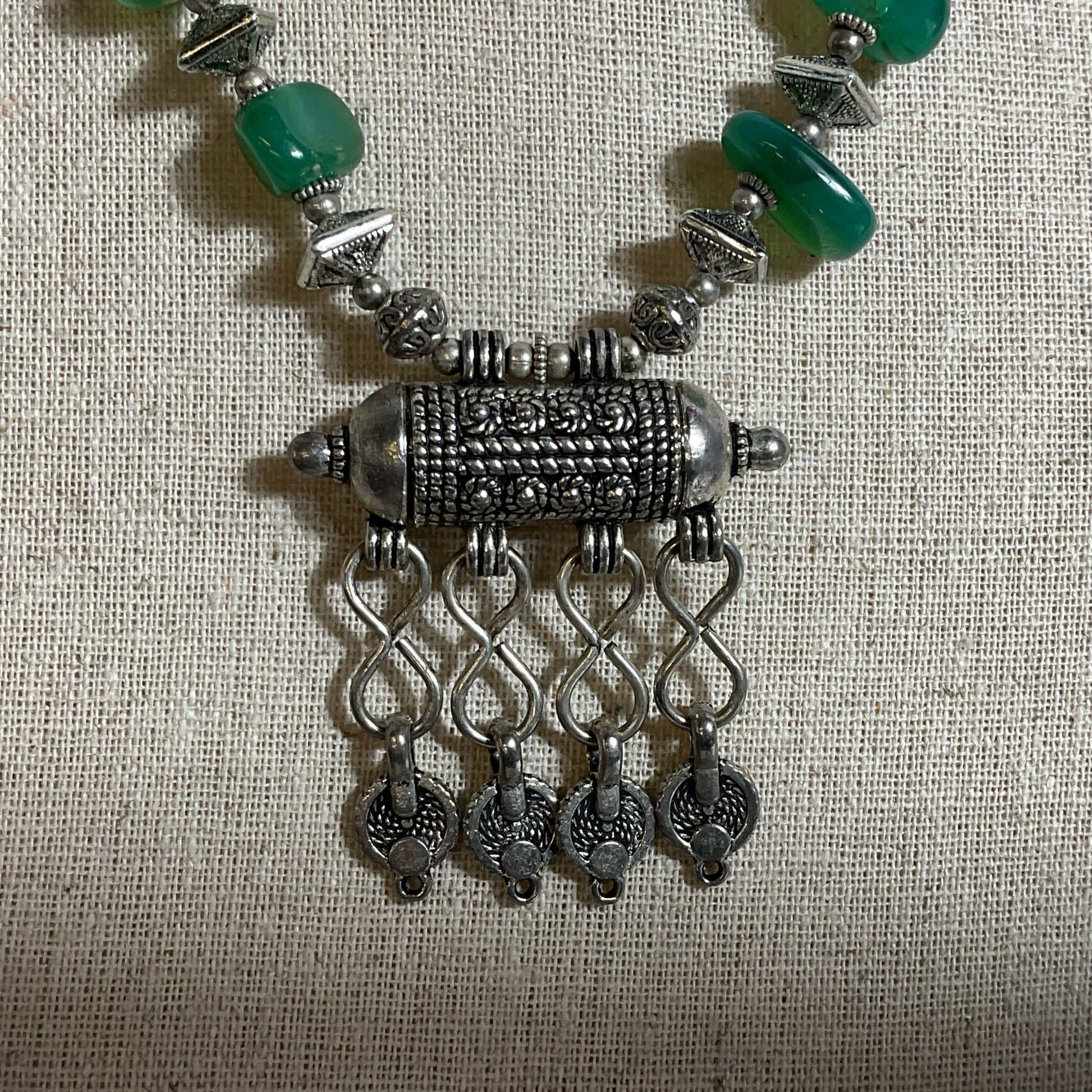 Ethnic Silver Tone Green Gemstone Beaded 18" Necklace