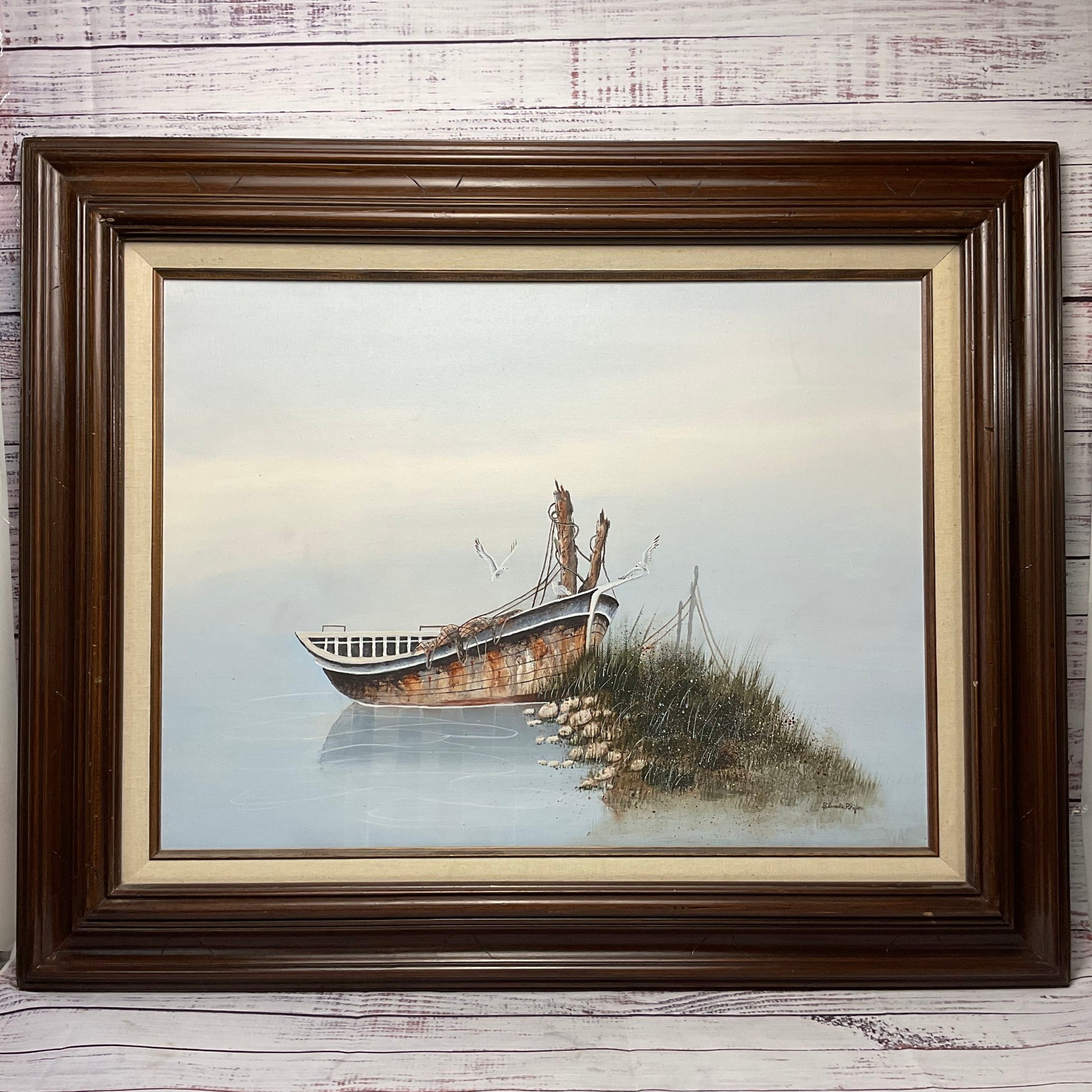 Description: Fishing Boat Seagulls Oil on canvas by Blanche Phifer Signed. Framed