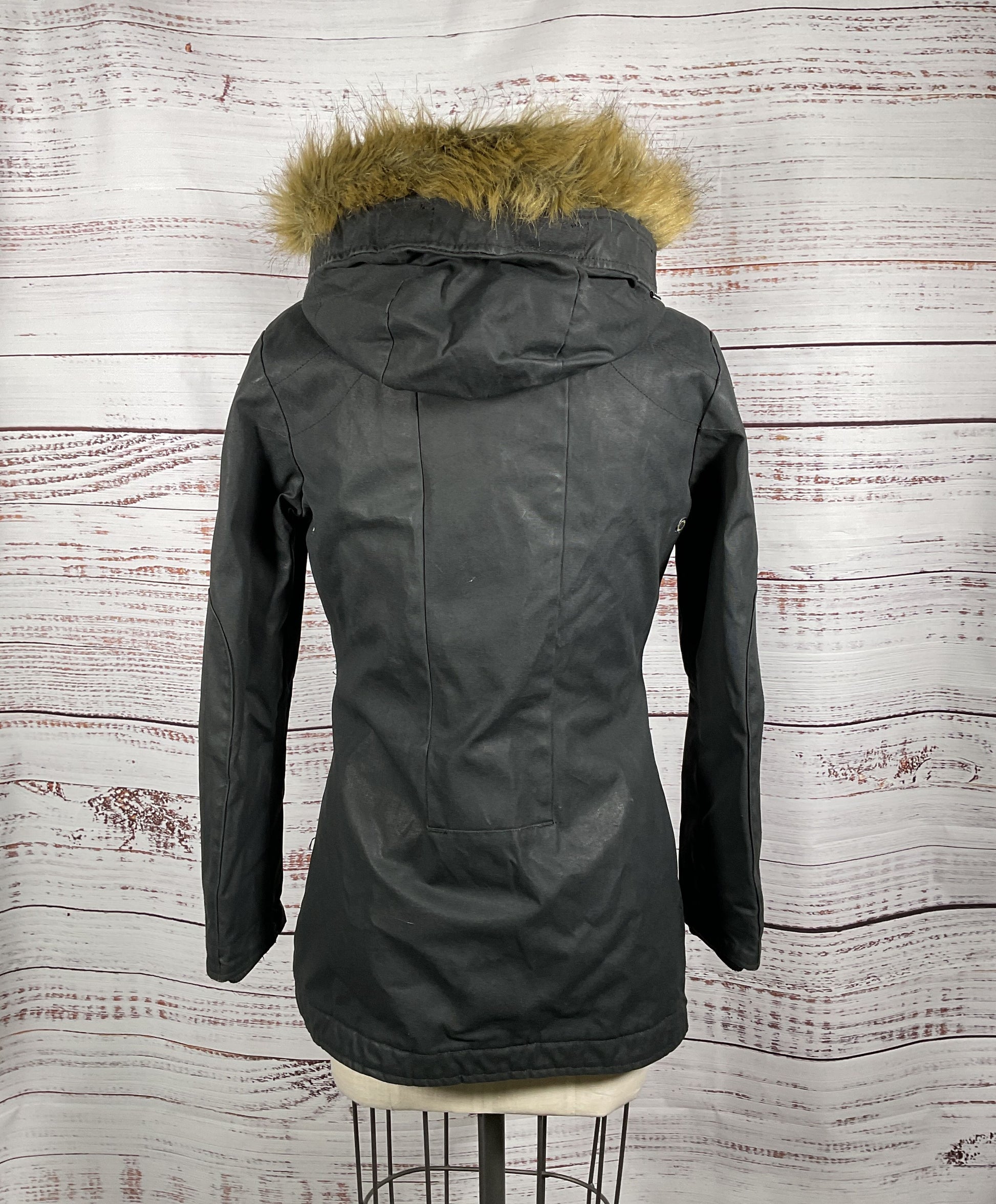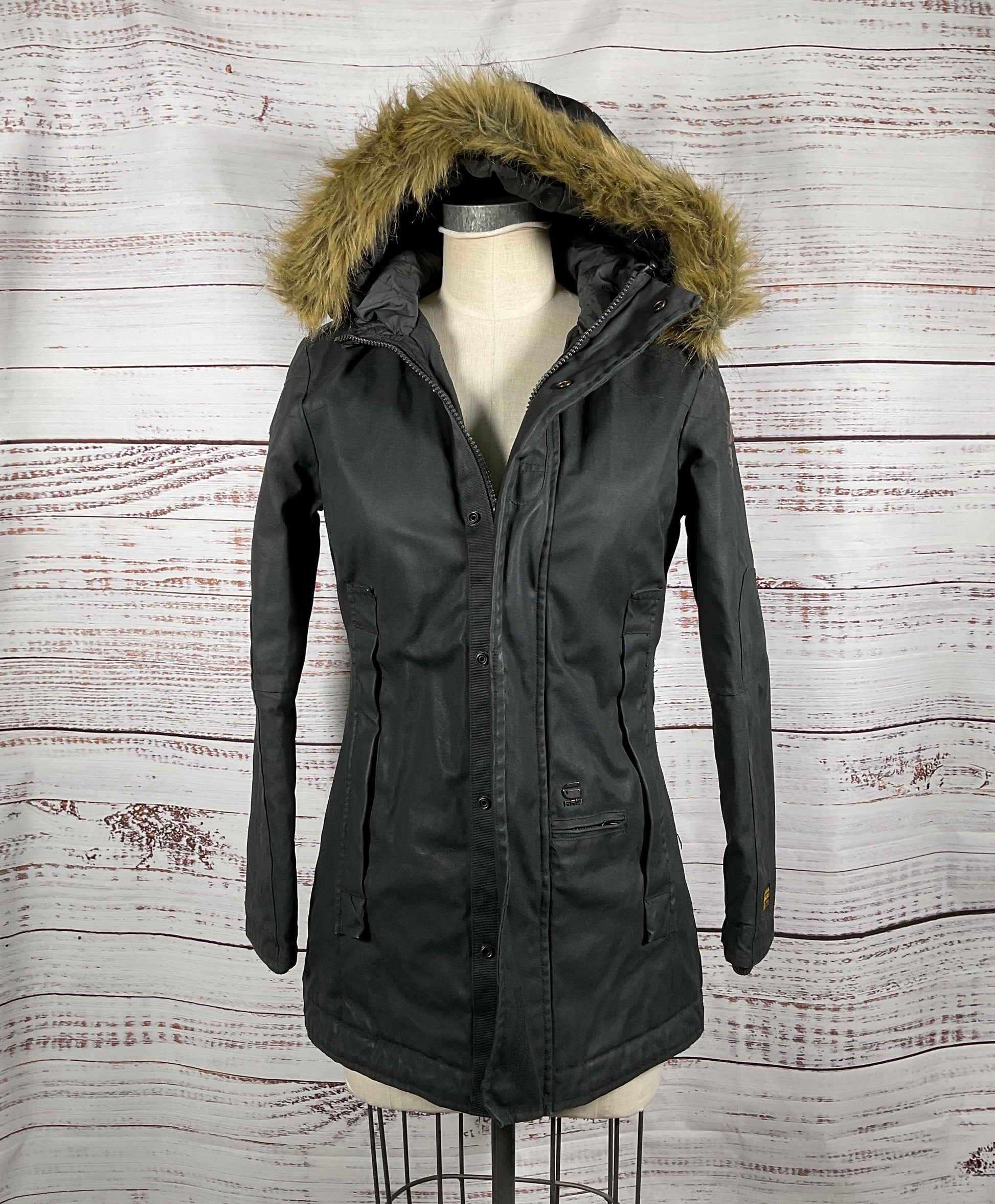 G-Star RAW Black Zip-Up Mid Length Coat with Fur Trim Hood - Size Medium