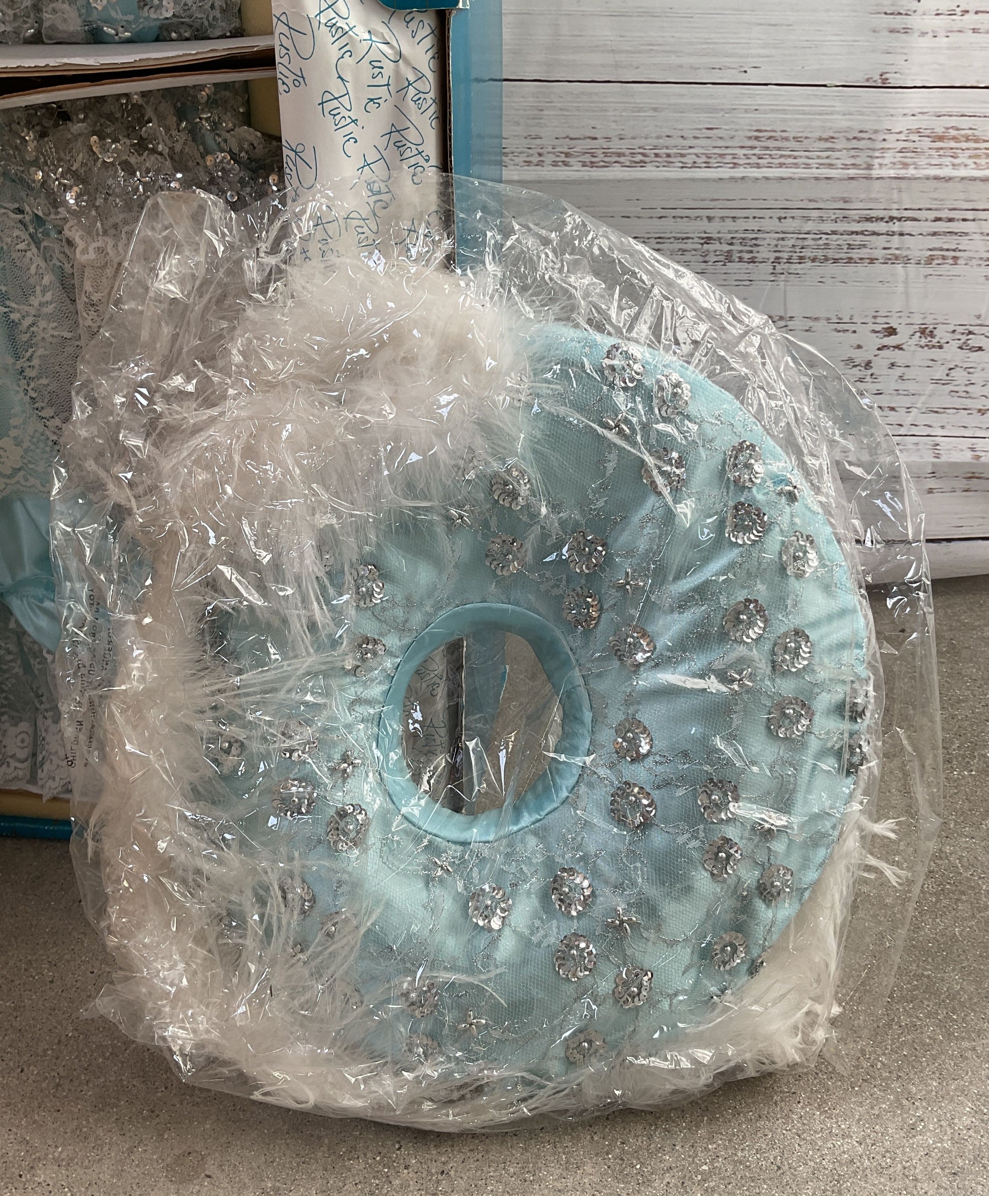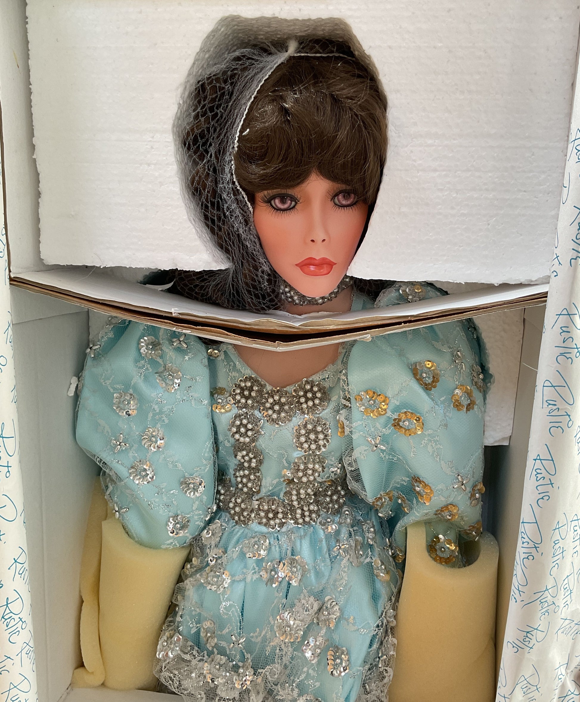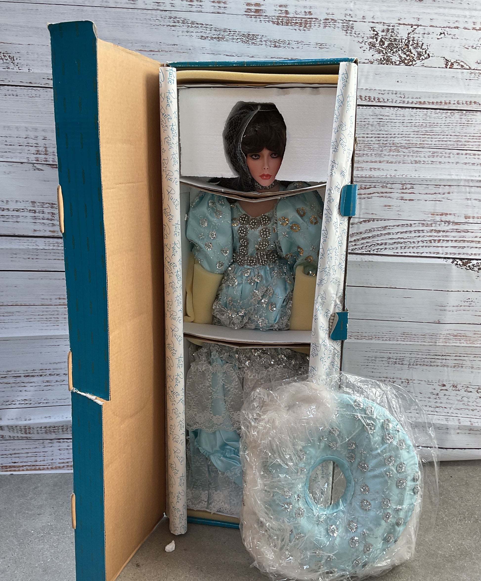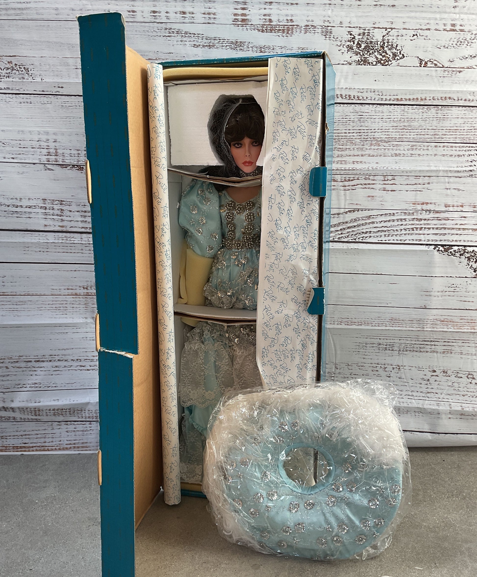 Doll features lavender eyes, brunette hair and sports a blue gown with accompanying hat