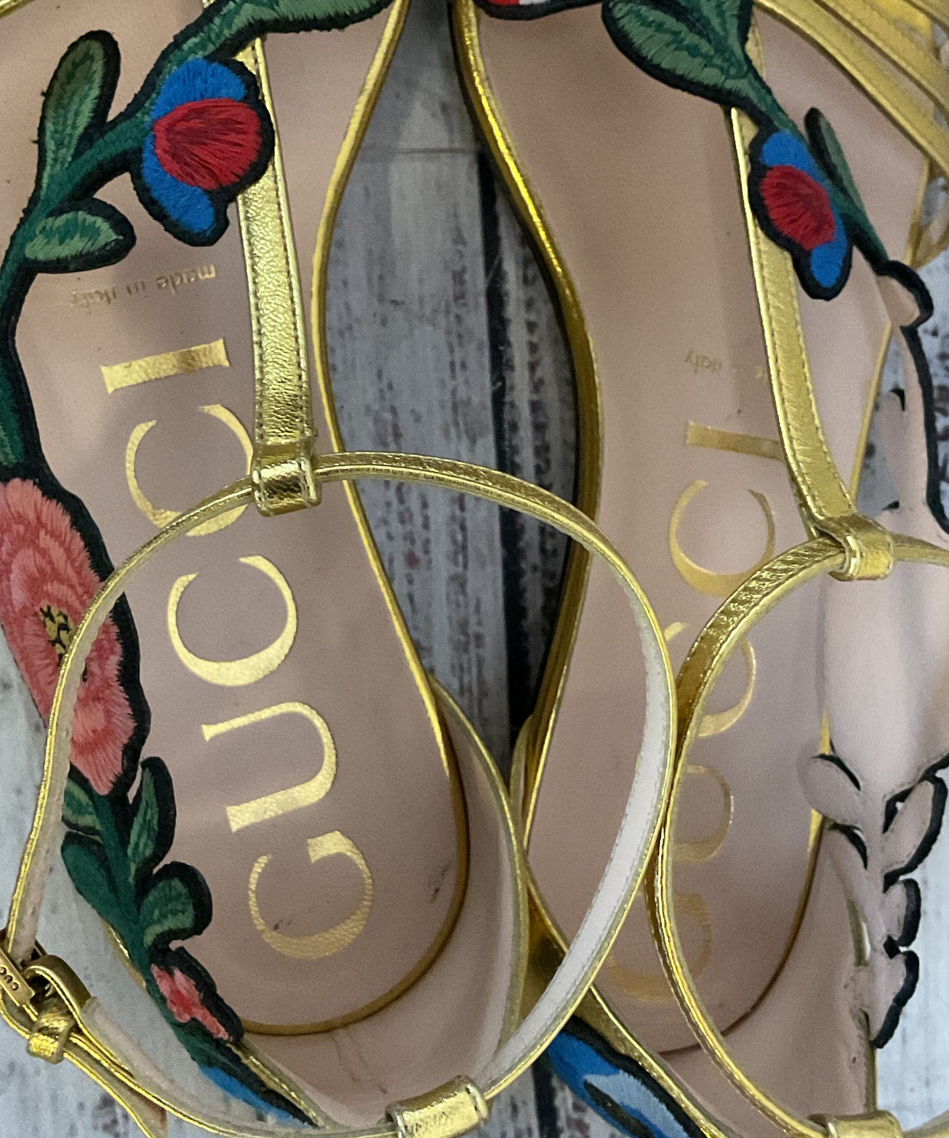 Gucci Leather Ophelia Floral Embroidered Flat Sandals Gold 6