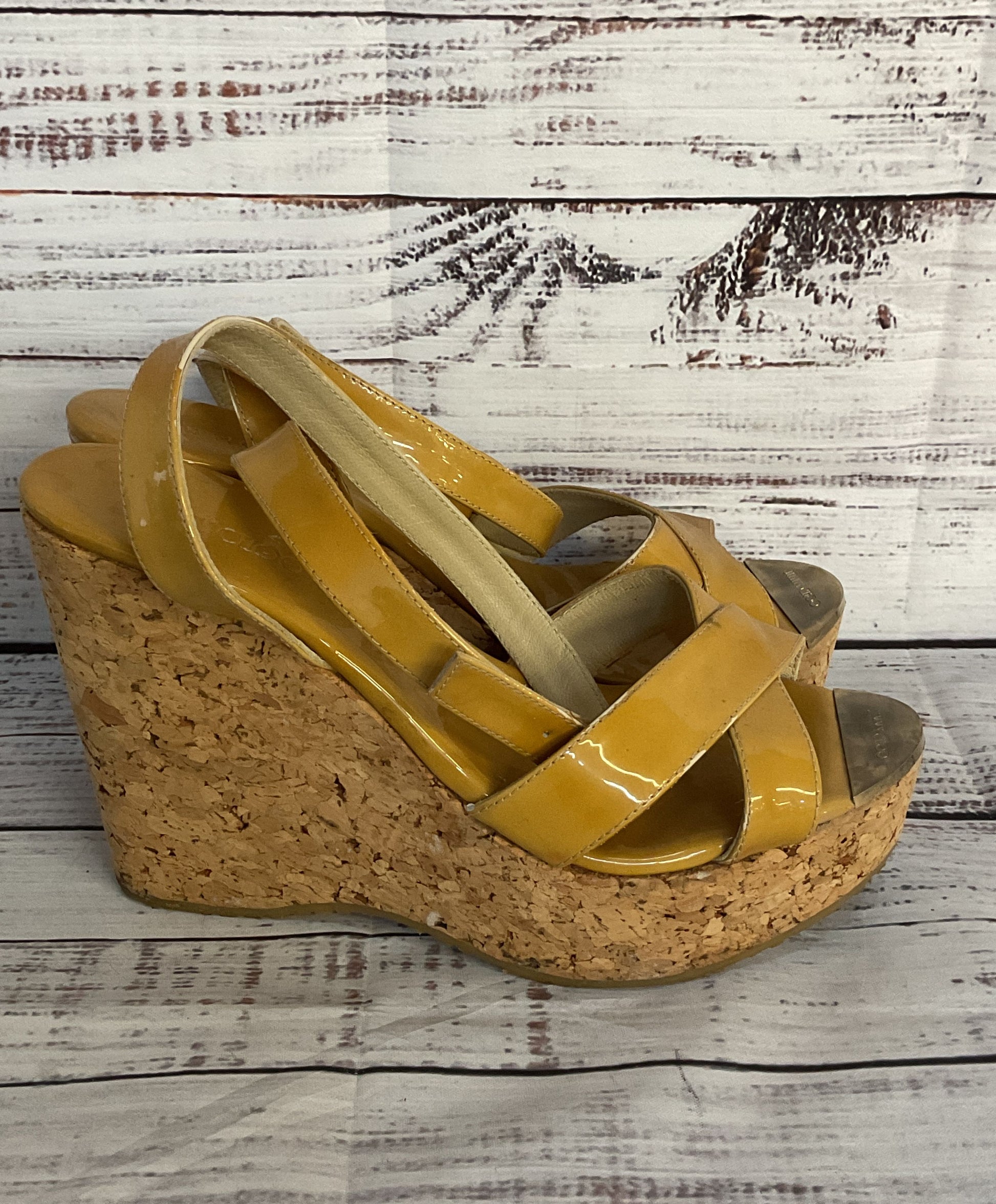 Jimmy Choo Patent Leather Strappy Cork Wedge Sandals Beige 8