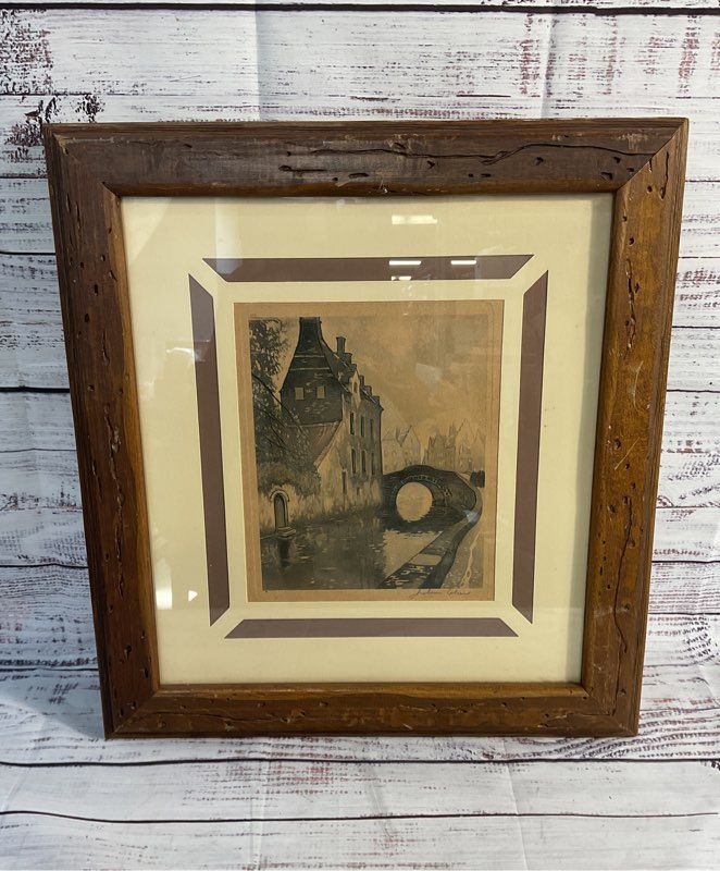 Description: Julien Celos 1884-1953 Belgium Canal Scene Charcoal Etching Signed Print Print Signed. Matted & Framed