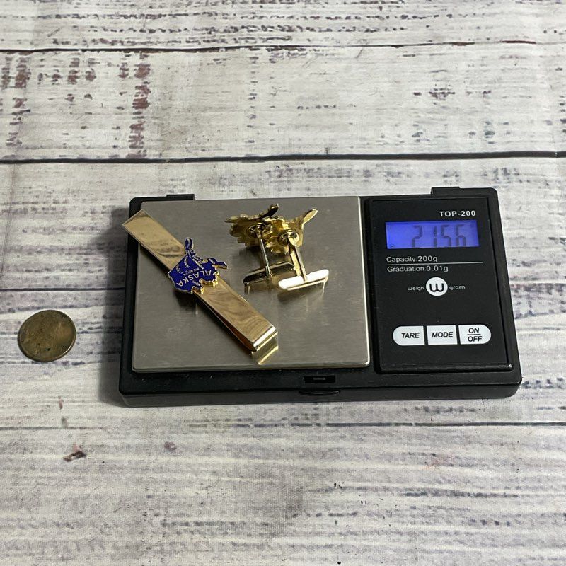 Kinney Blue Enamel/Gold Tone Metal Alaska State Outline Cufflinks & Tie Bar Set