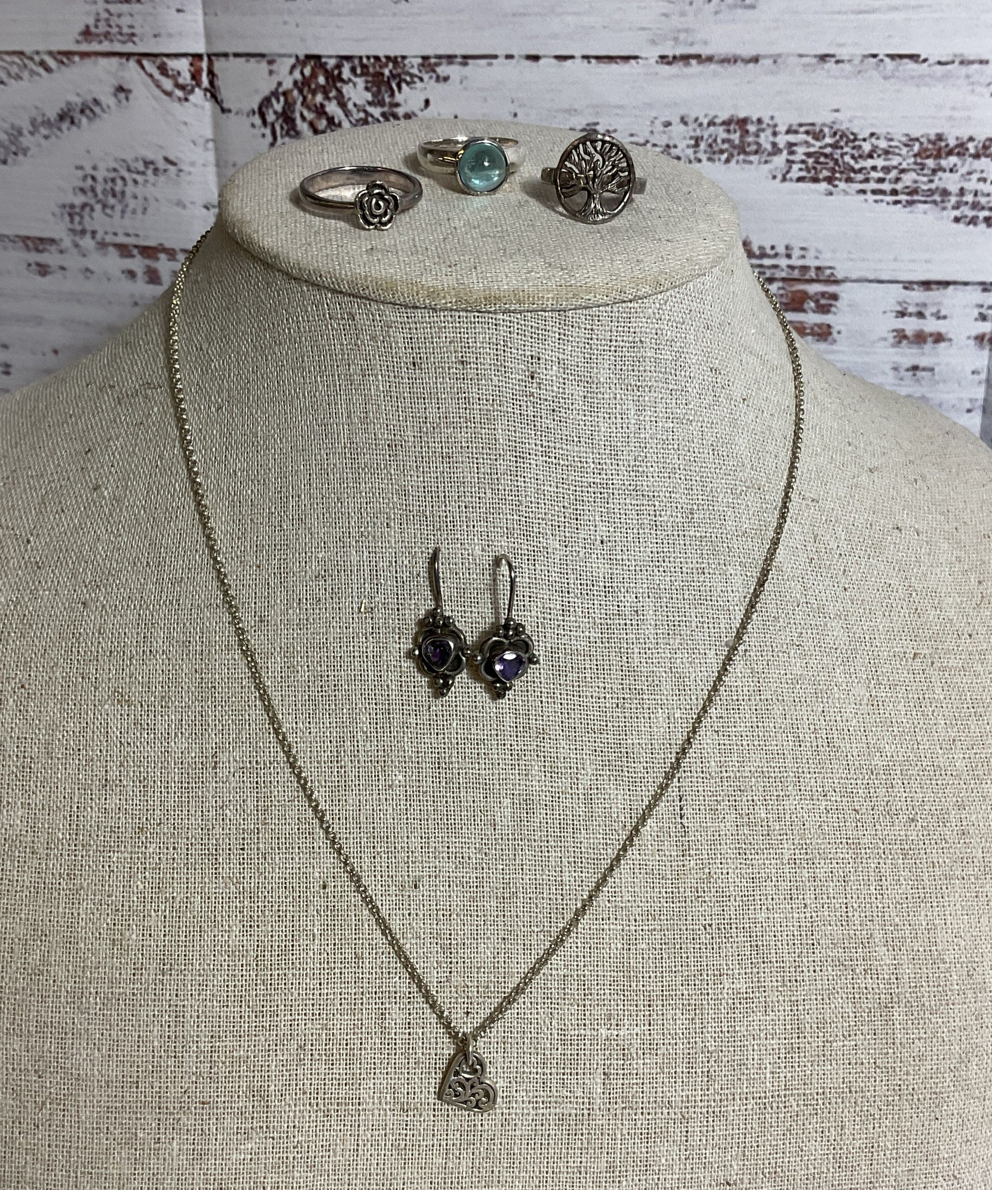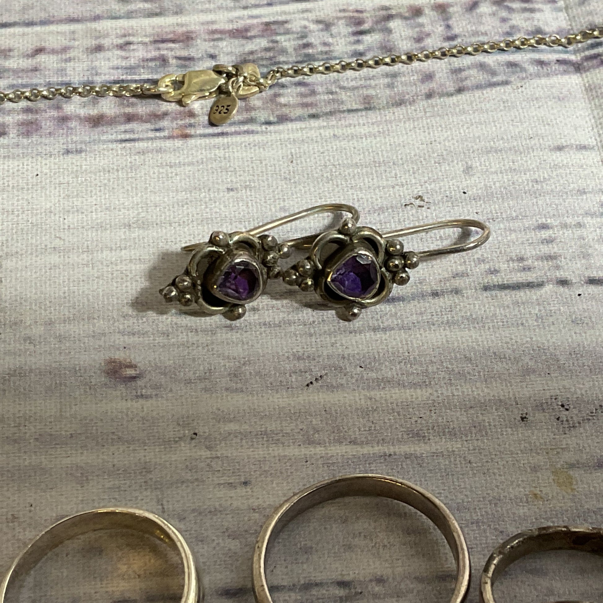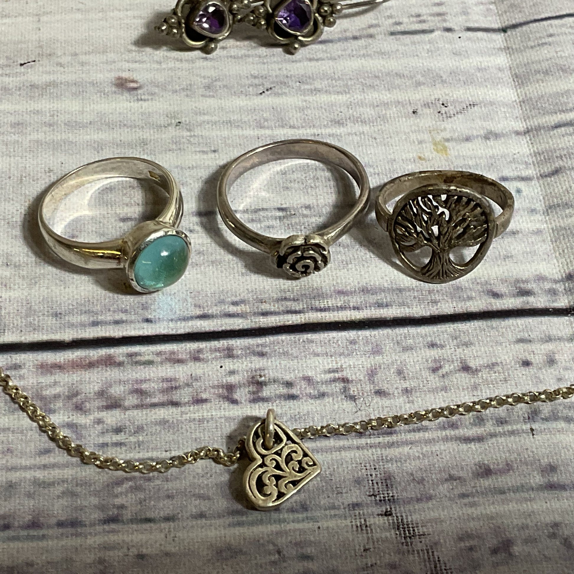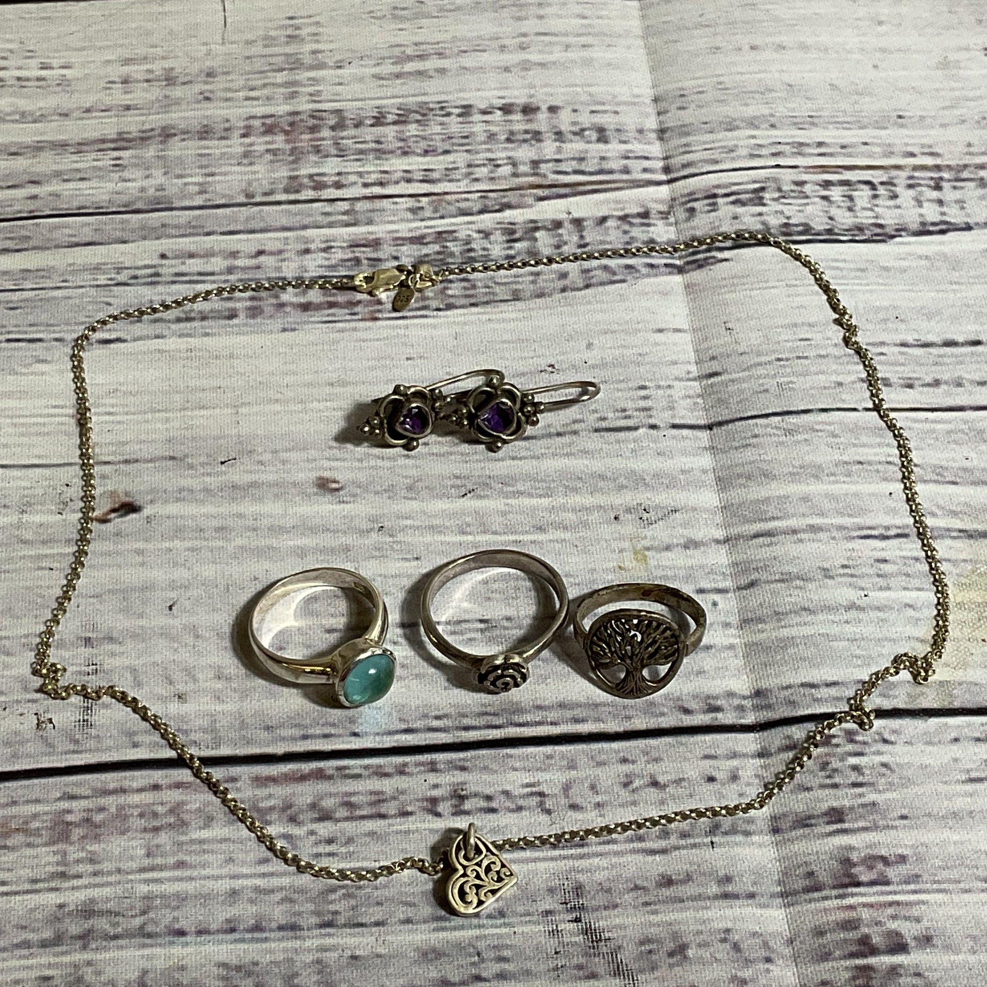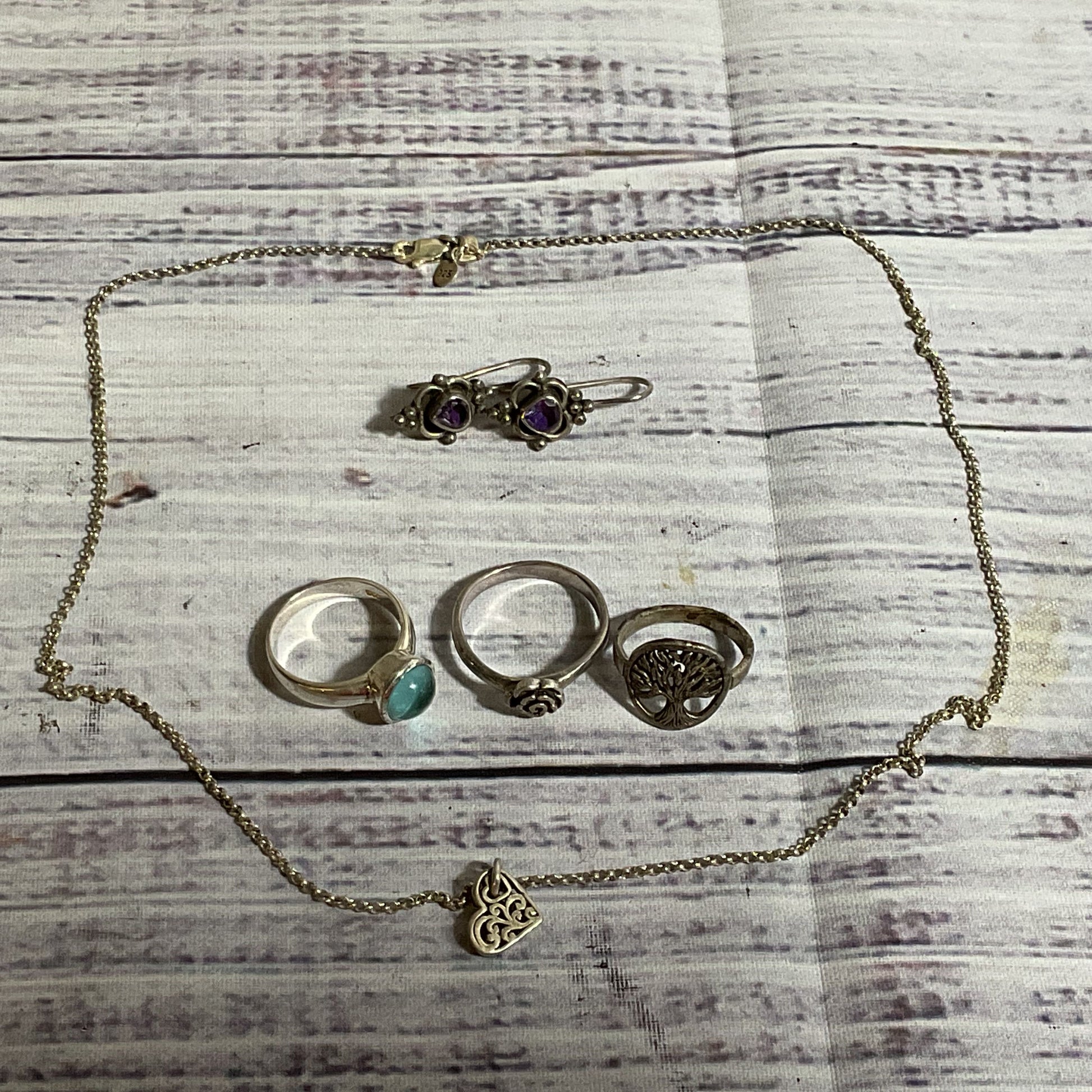 Lot of Sterling Silver 3 Rings, Earrings, Necklace- 14.62g