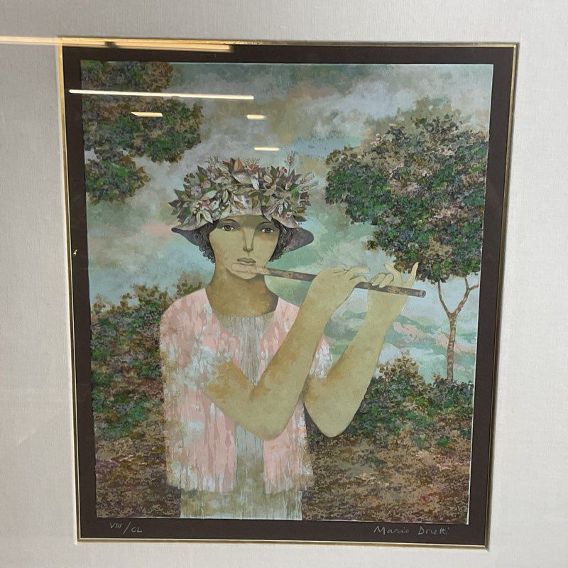 Description: MARIO DORETTI Limited Edition VIII/CL Woman Playing Flute Serigraph SERIGRAPH Signed. Framed