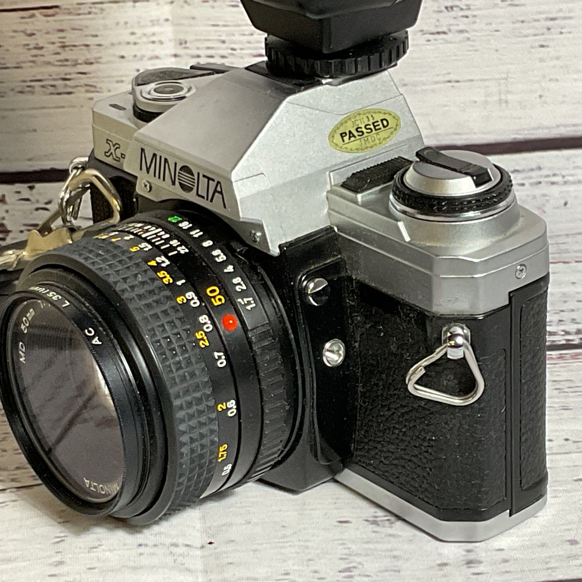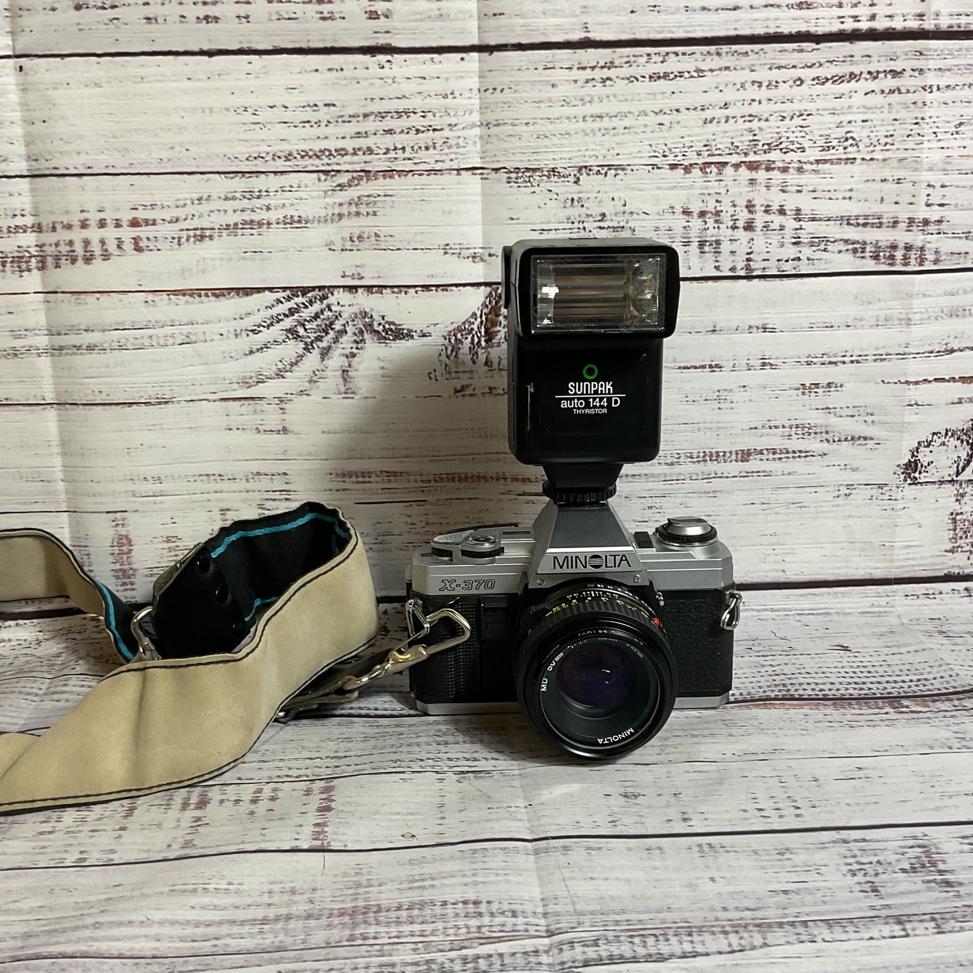 MINOLTA X-370 SLR 35mm Film Camera w/ Minolta MD 50mm f/1.7 Lens & Sunpak Flash