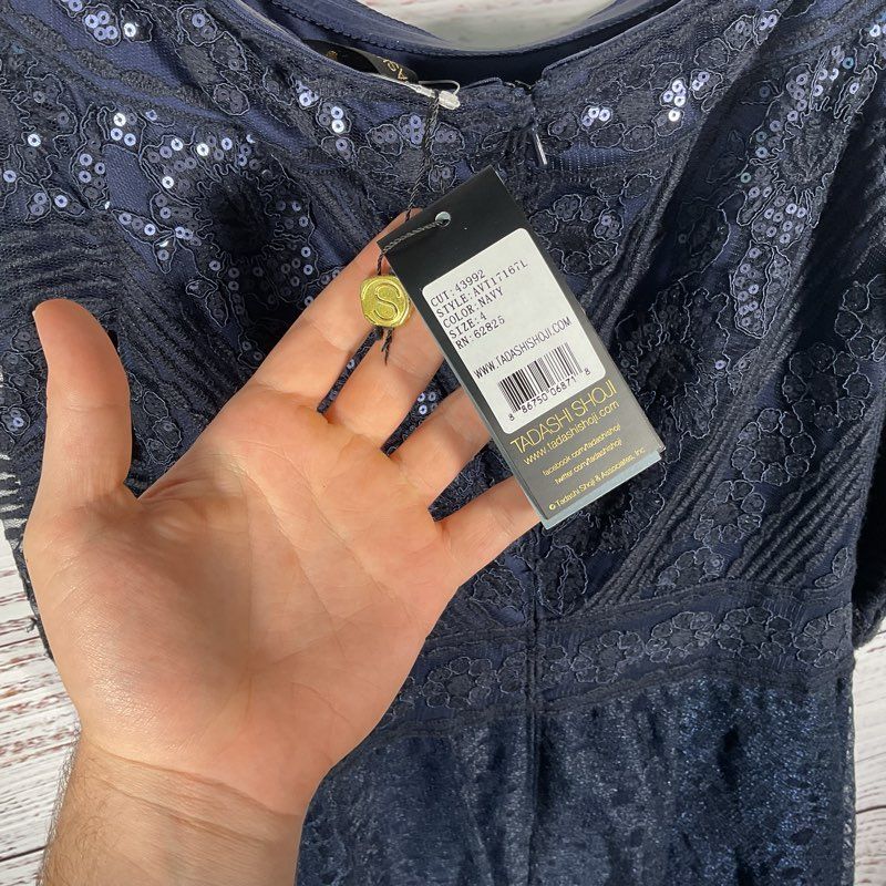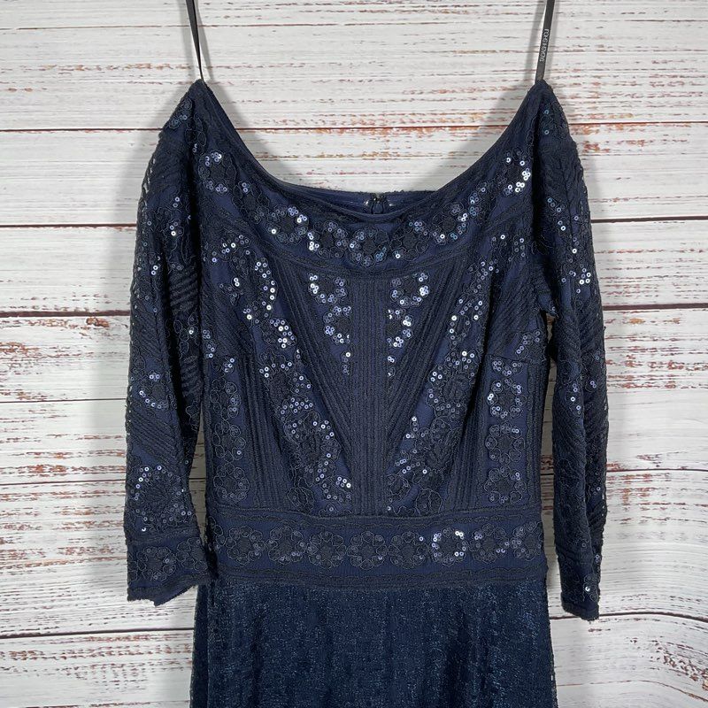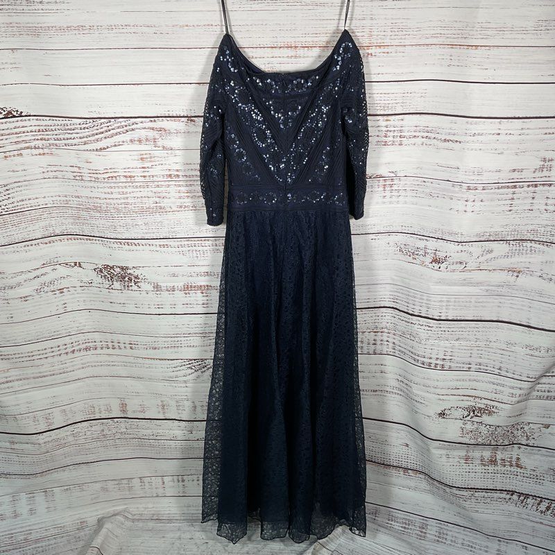 NWT Tadashi Shoji Bridal Silana Off Shoulder Navy Blue Sequin Gown Dress sz 4