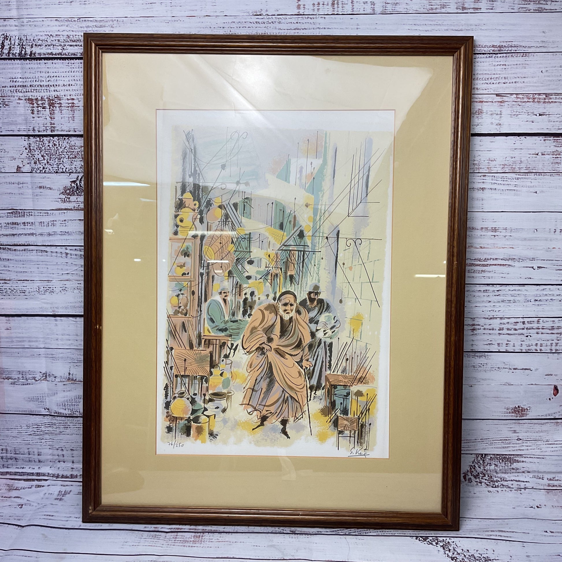 Description: Old Man Walking Through Market Print by Schmuel Katz Signed.