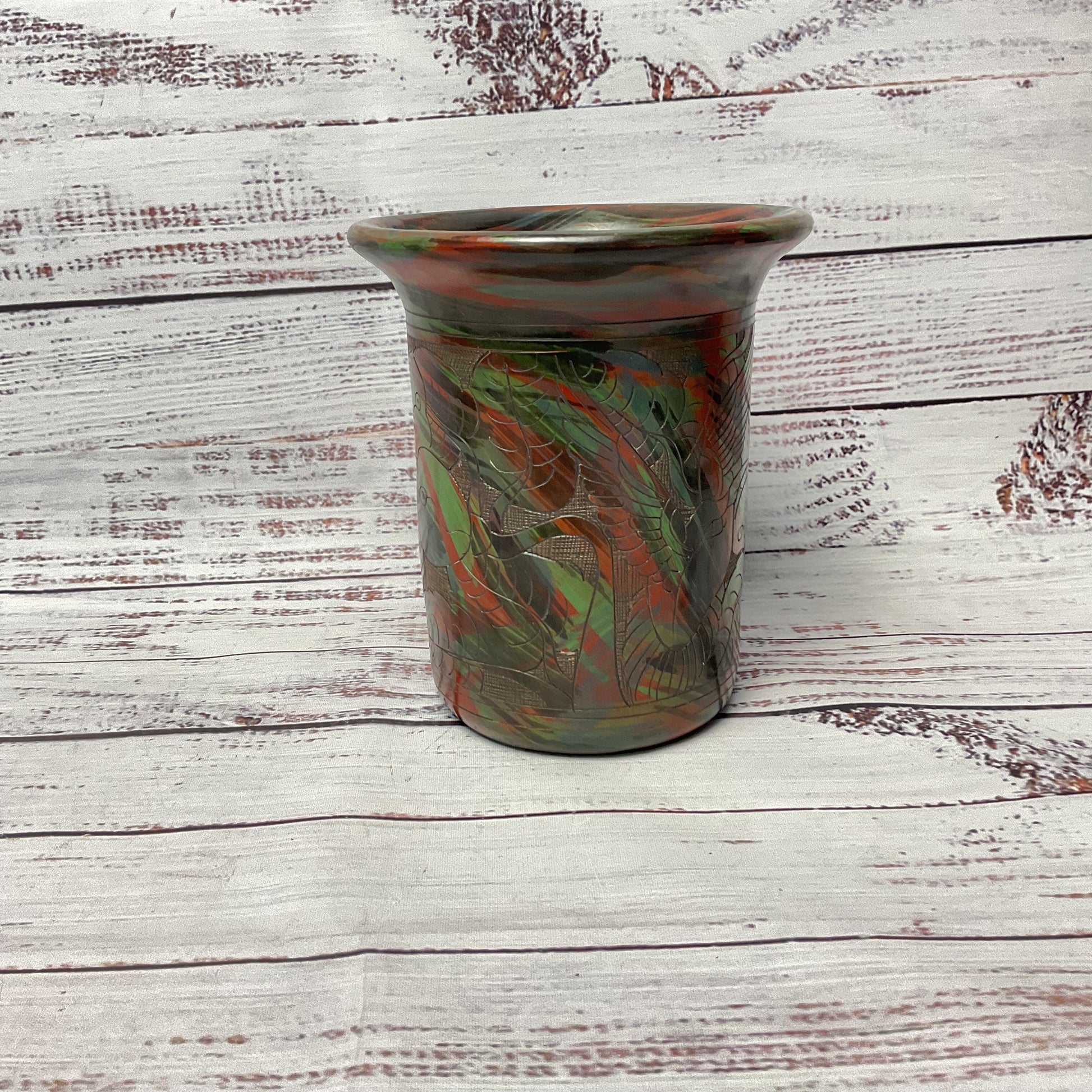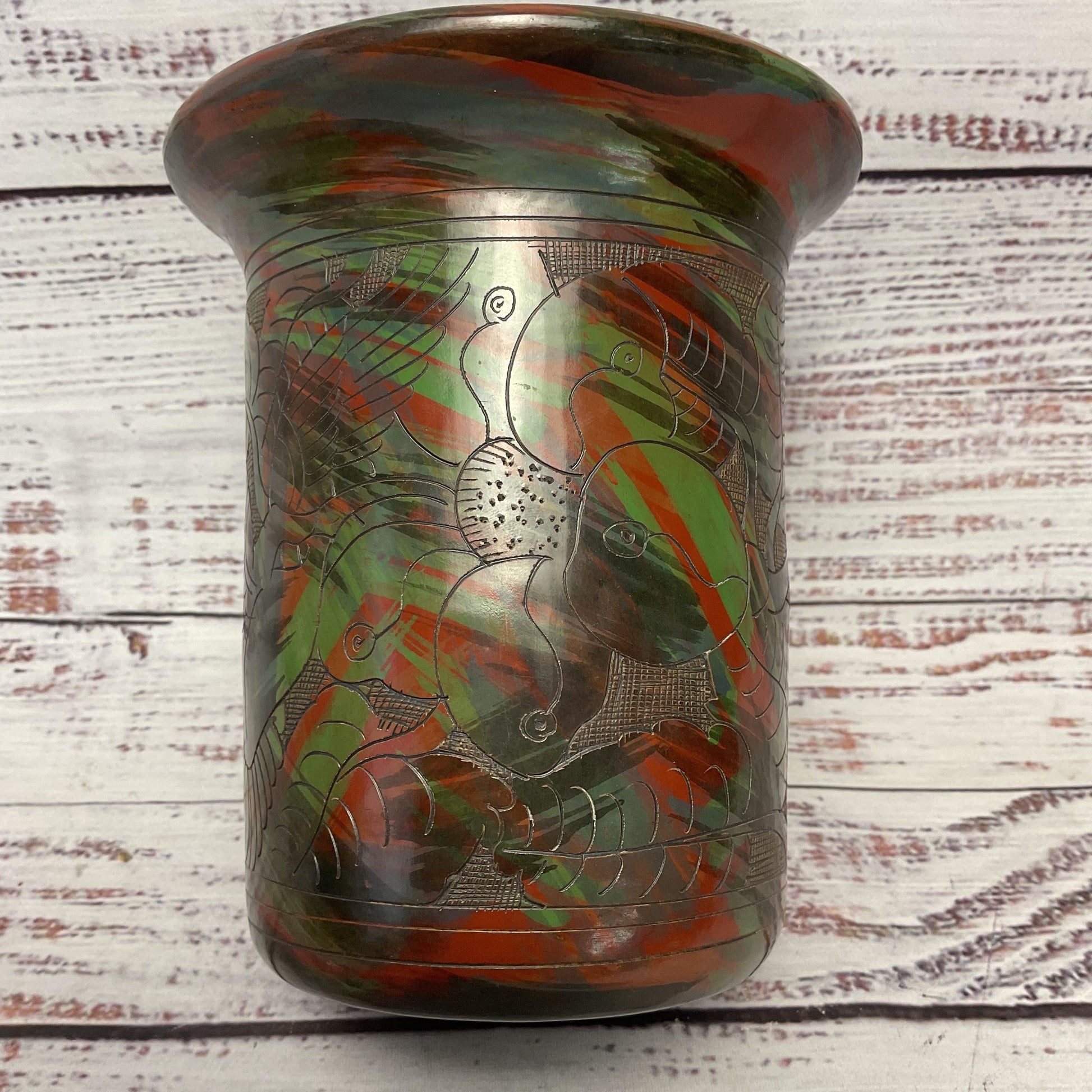 Red Green Black Hand Carved Bird Flower Clay Vase 5"x5"x6"