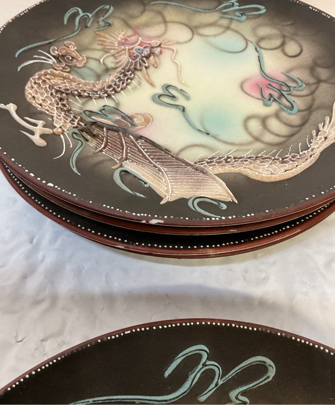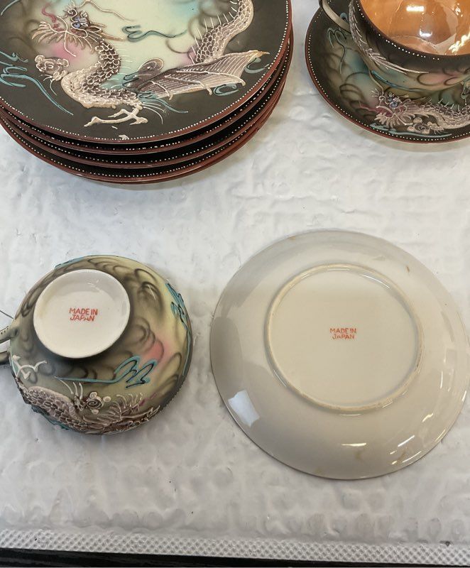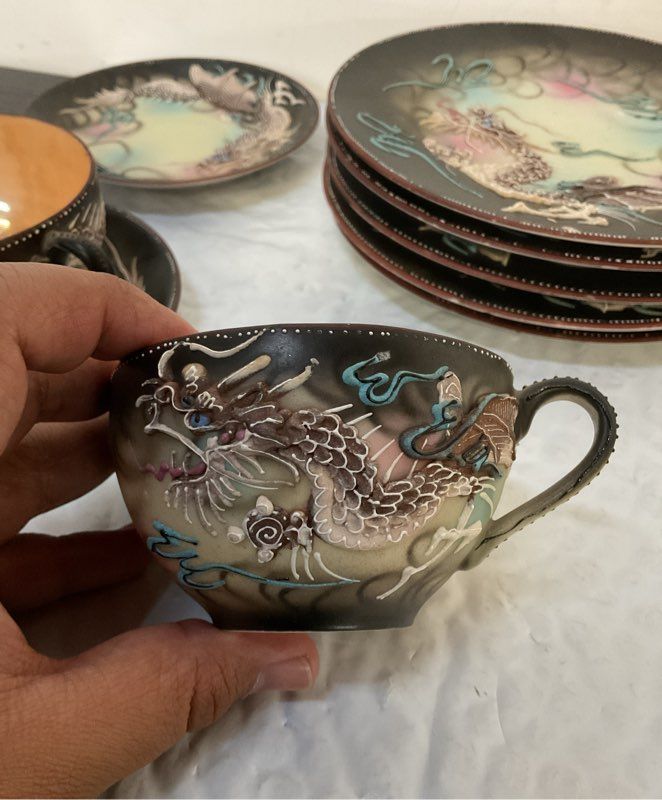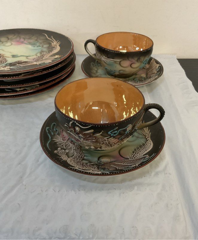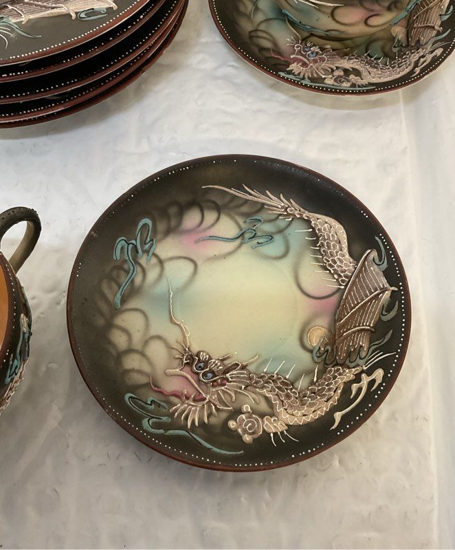 Set of Vintage Dragonware Textured Moriage Plates, Cups, & Saucers Japan