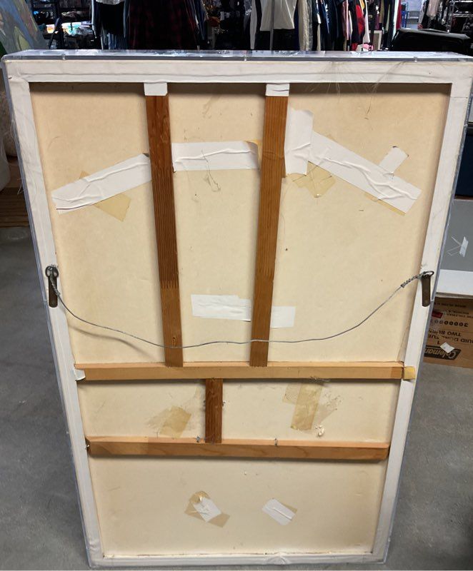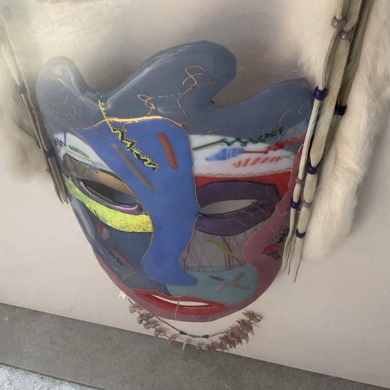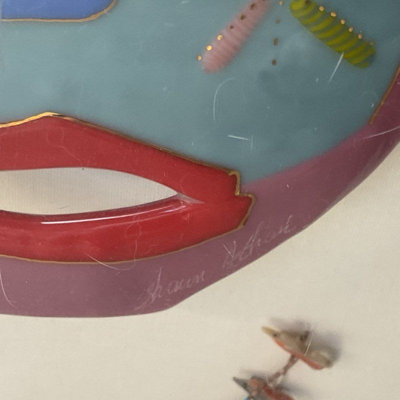Signed SHAWN ATHARI Glass Mask with Feathers & Necklace with Shadowbox Display