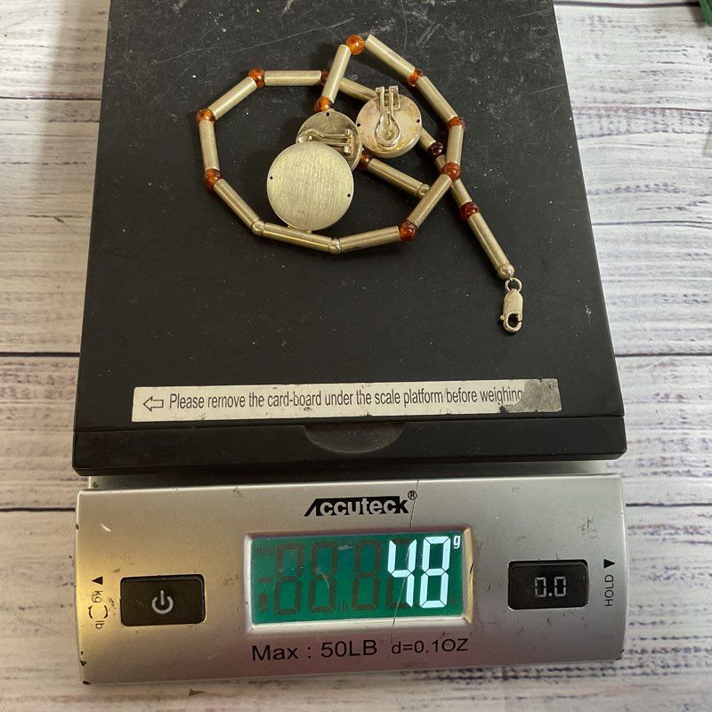 Sterling Silver Bar Beads & Cabochon Amber 16.5" Necklace and Earring Set- 48g