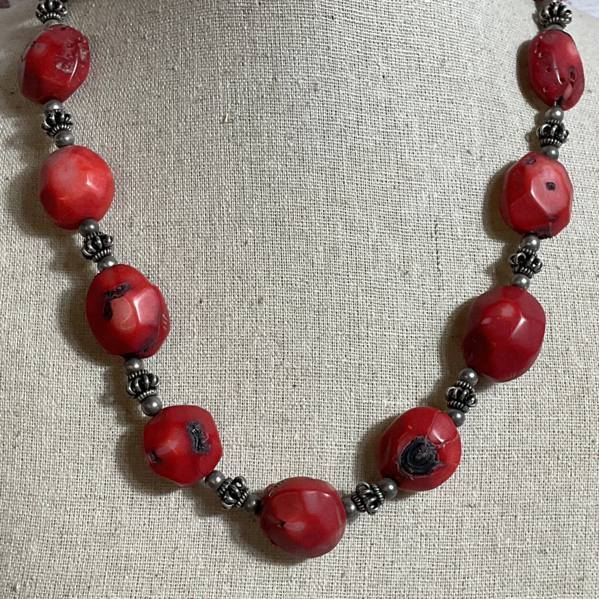 Sterling Silver Beaded Bold Chunky Red Coral Necklace- 24"