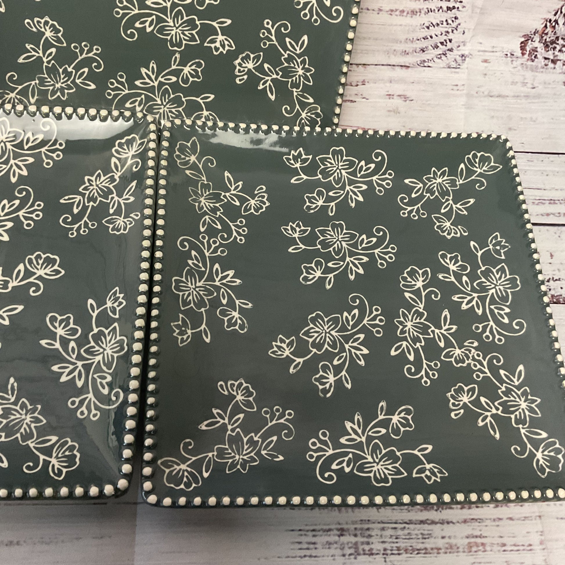 Temp-Tations Green Grey Floral Lace Ceramic Square Dish 8.5" 3 Dishes