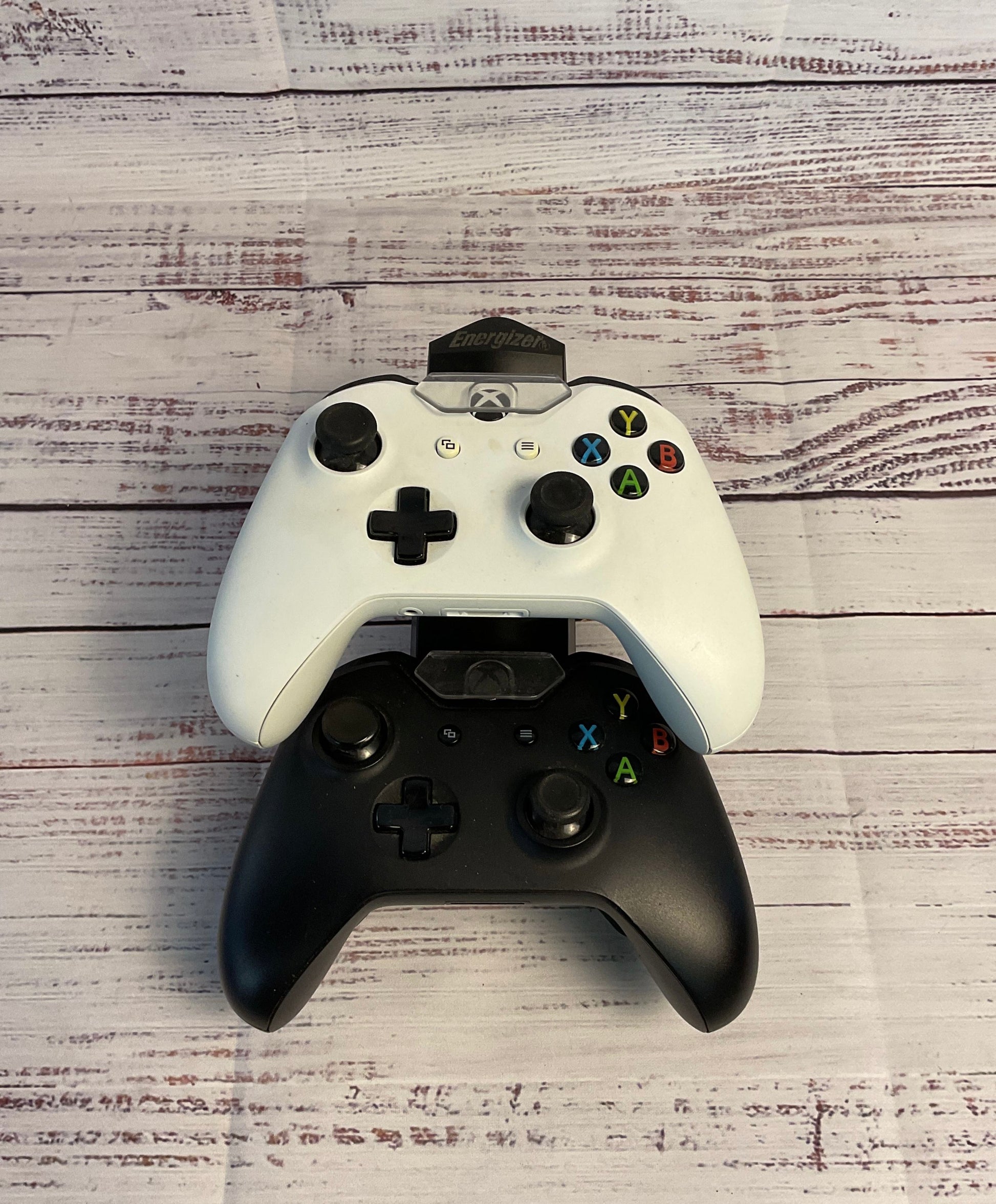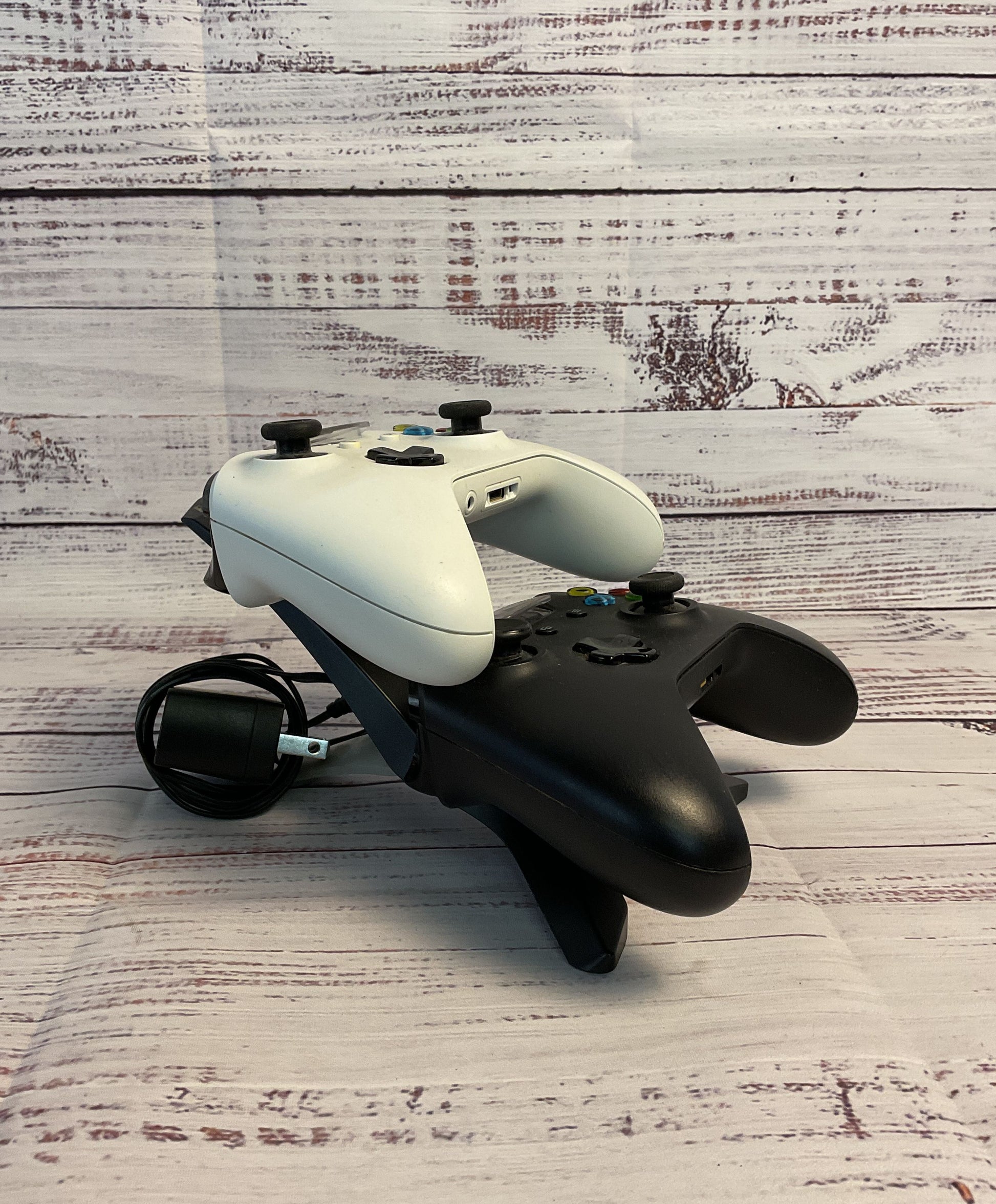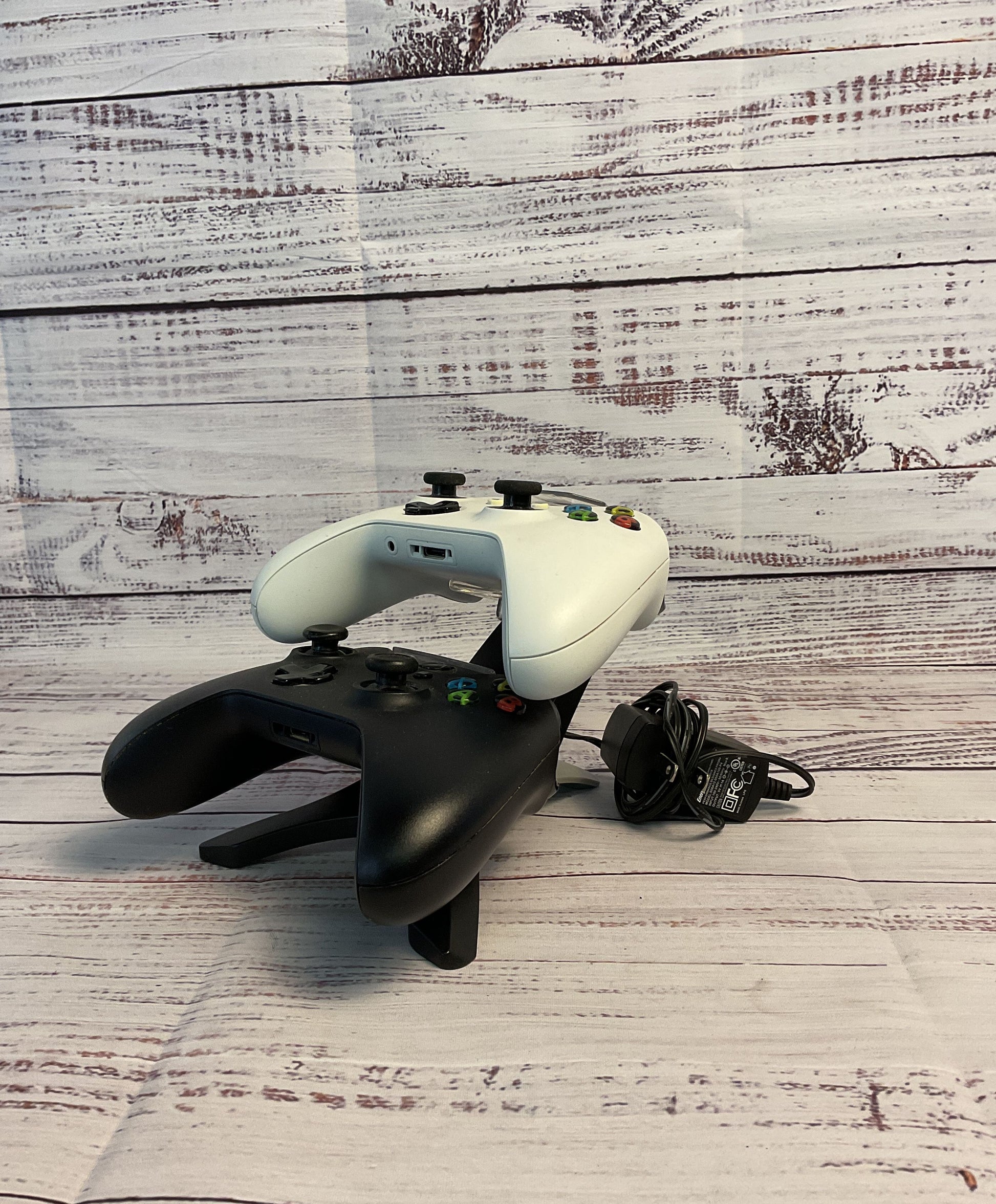 Two Black and White Microsoft Xbox Wireless Controllers with Charging Dock