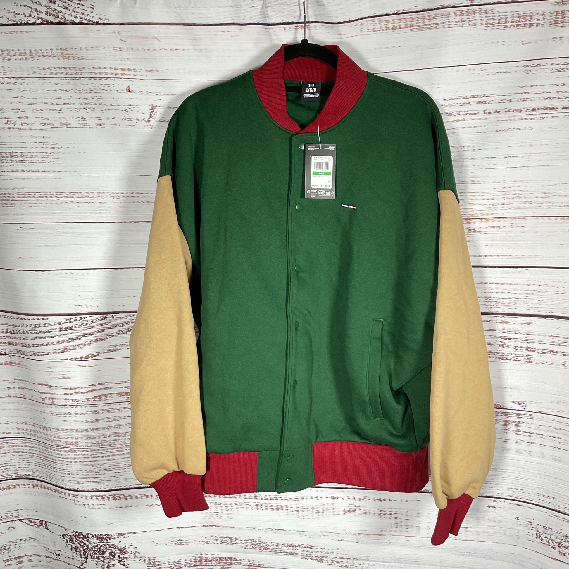 Under Armour Green Beige Icon Heavyweight Oversized Bomber Vasity Jacket - Size L