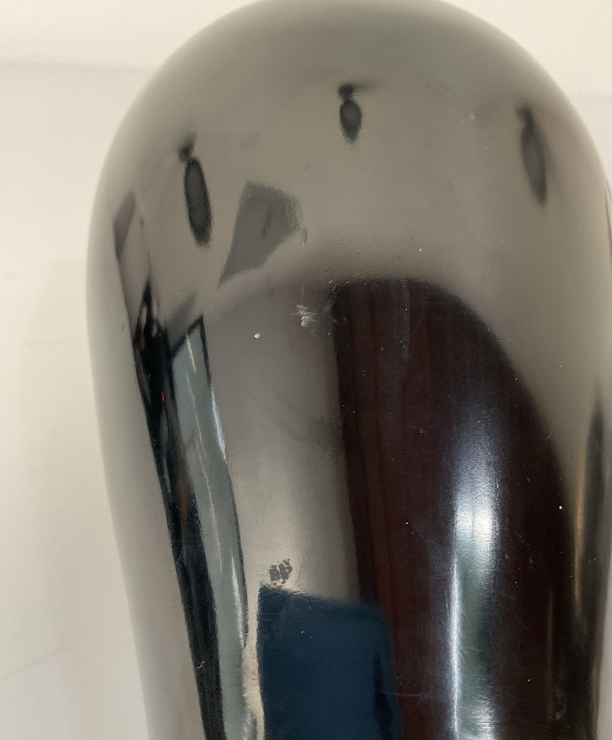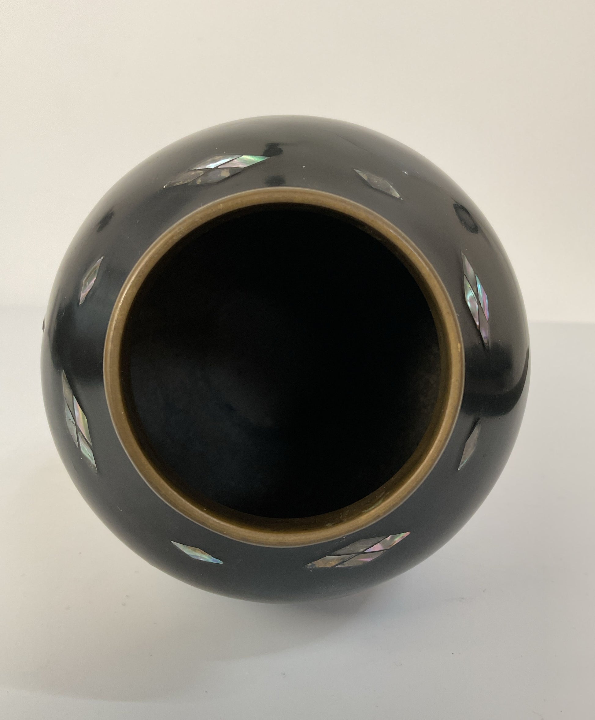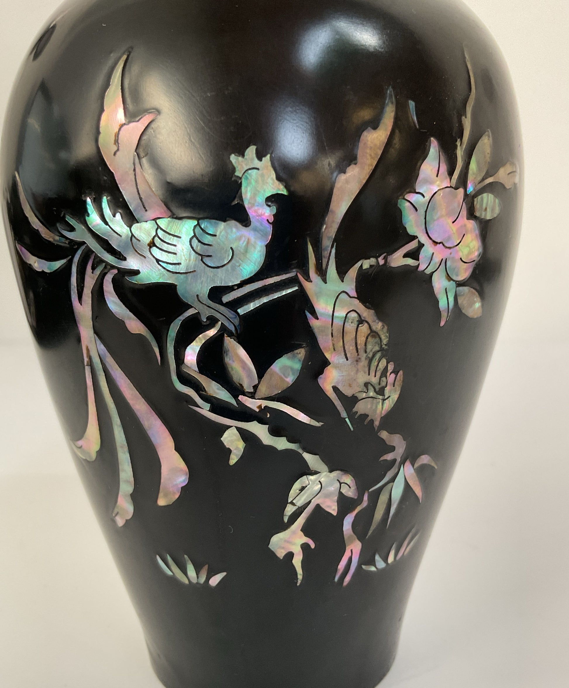 Vintage Brass Black Lacquer Floral Bird Motif Mother of Pearl Inlay Vase
