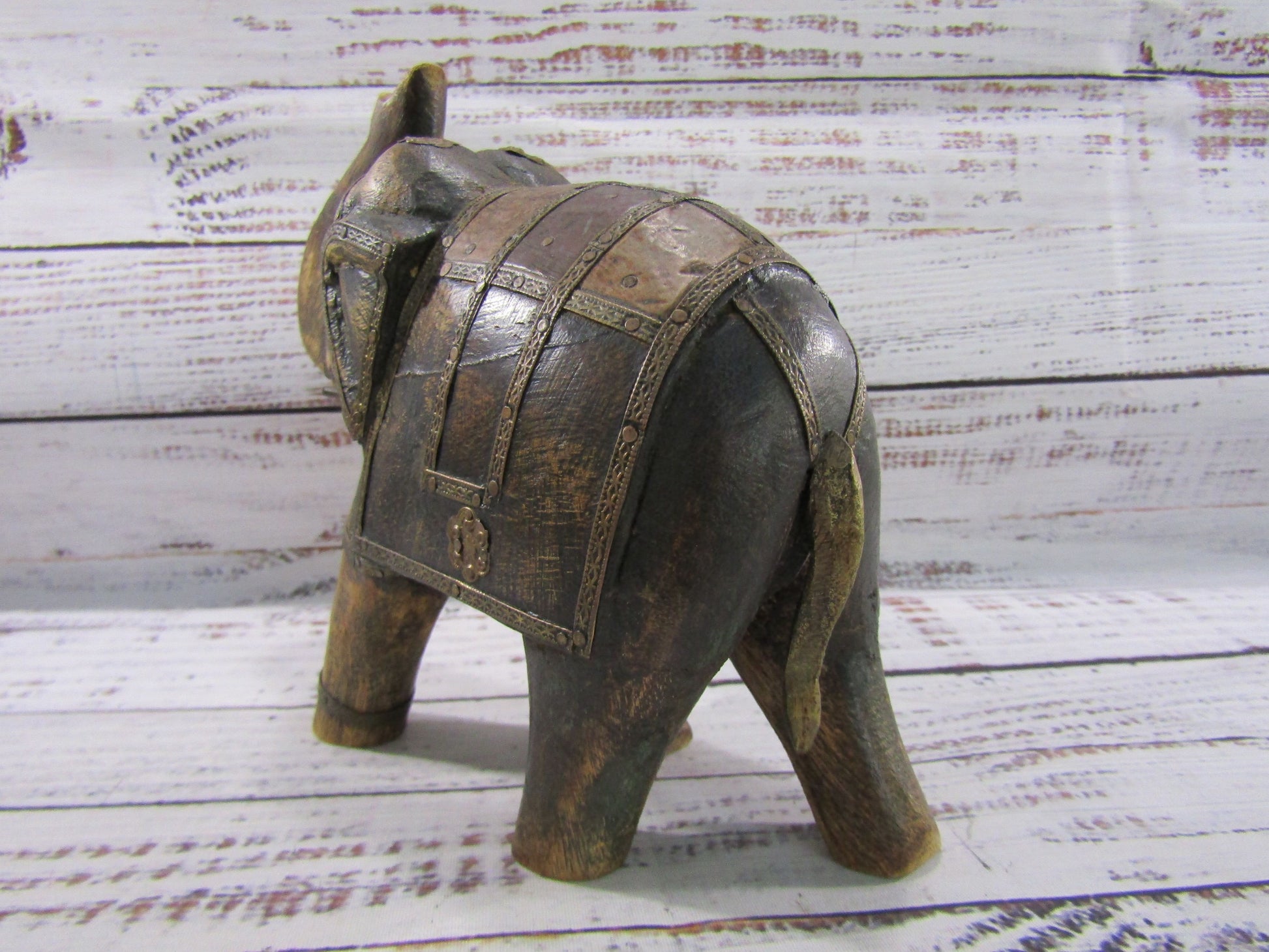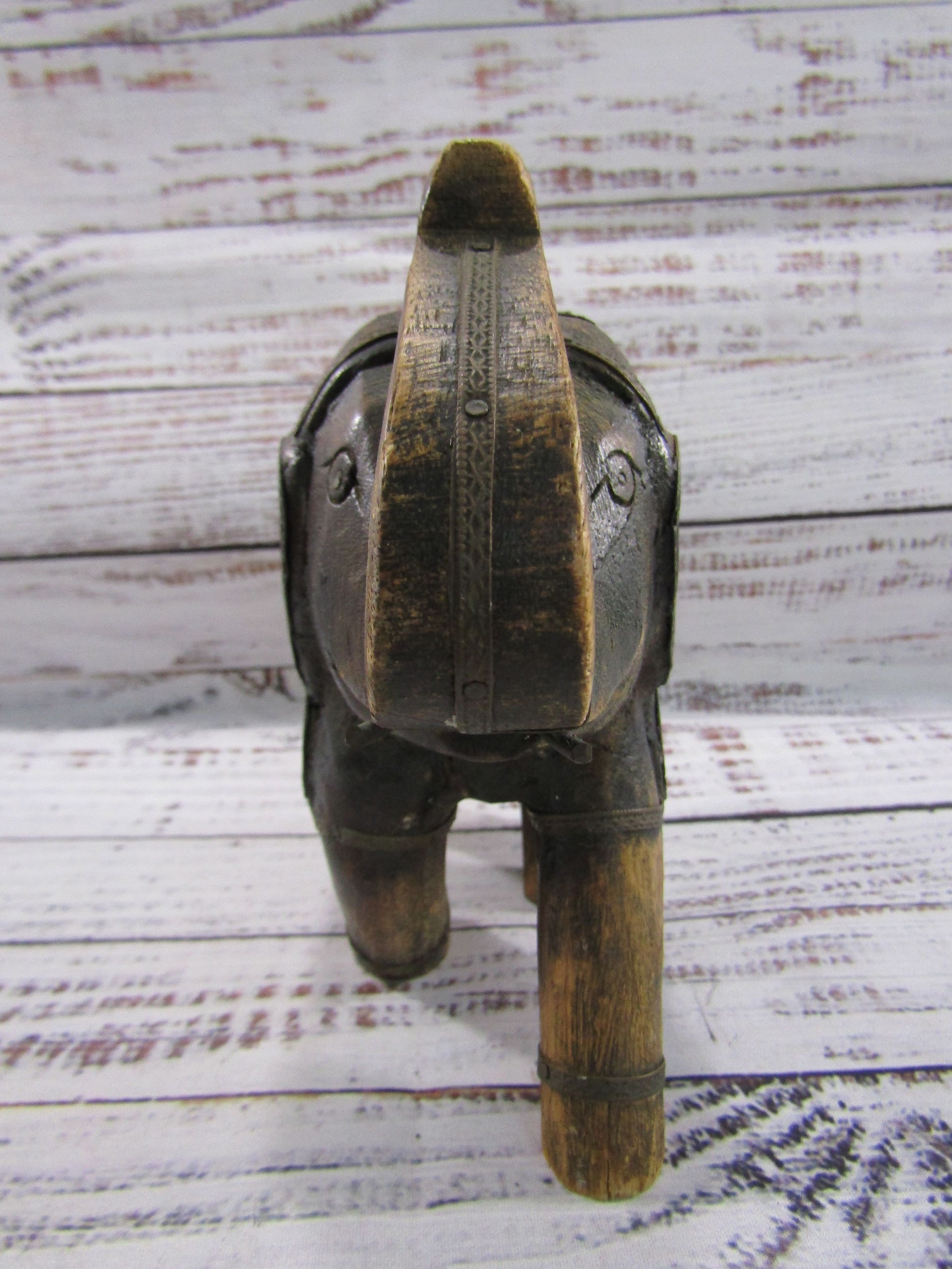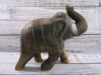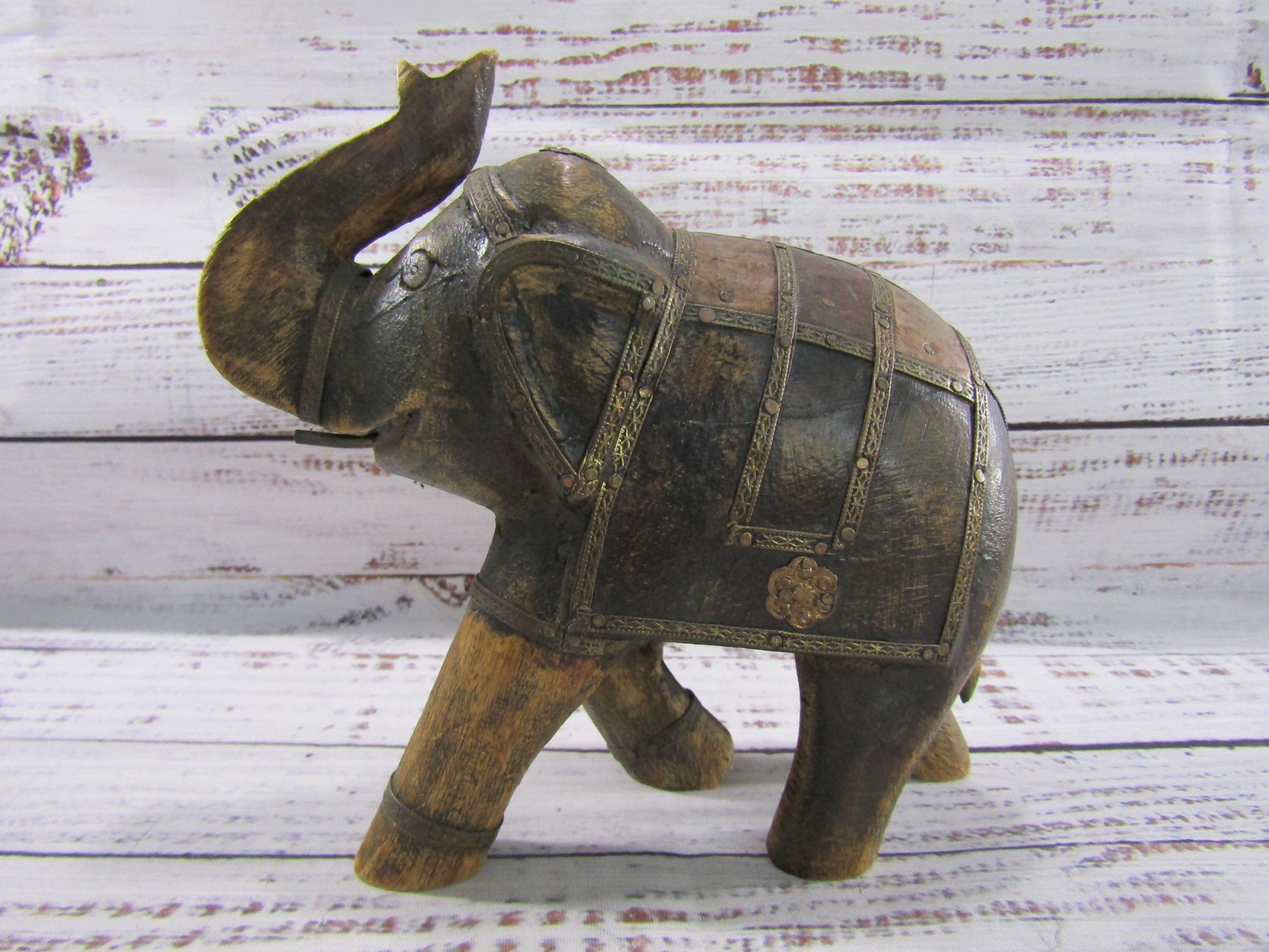 Vintage Handcrafted Wood Carved Brass Accent Elephant Figurine