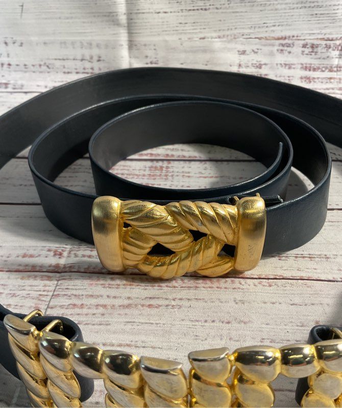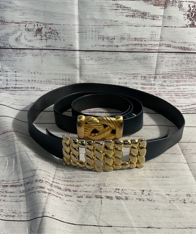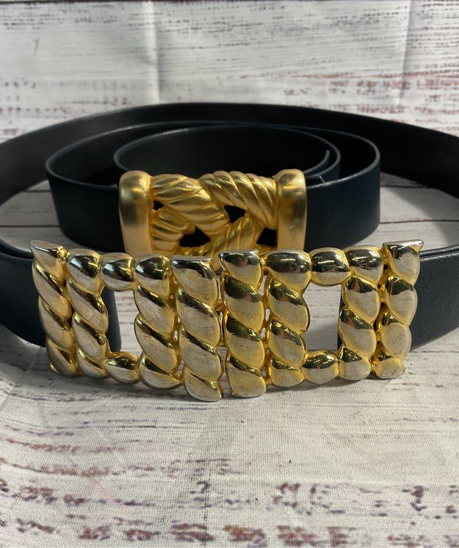 Vintage Lot of 2 Gay Boyer Women's Blue Leather Gold Buckles Belts