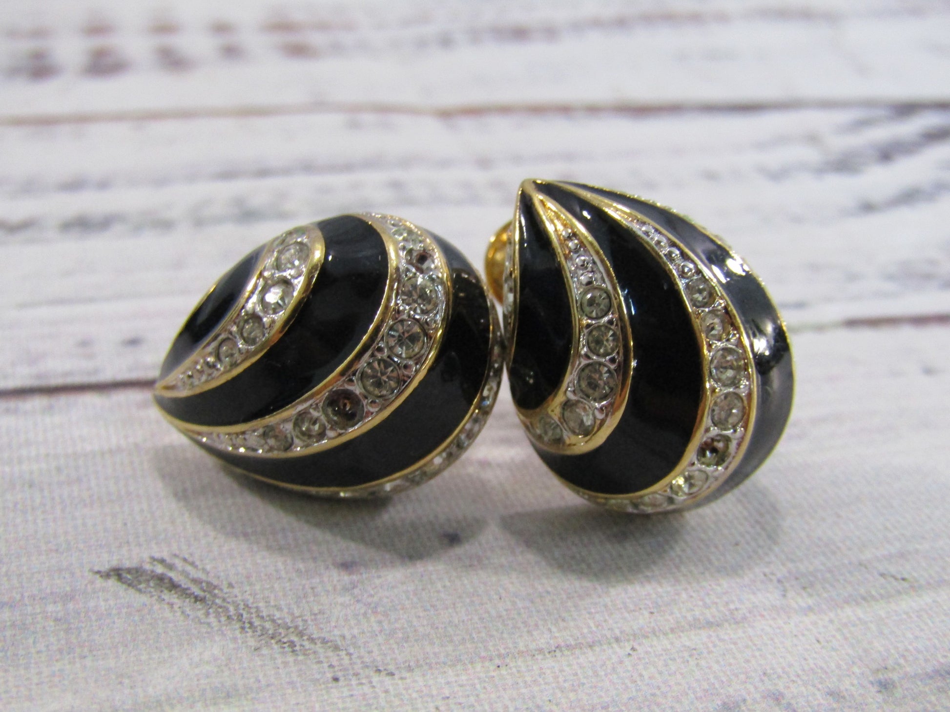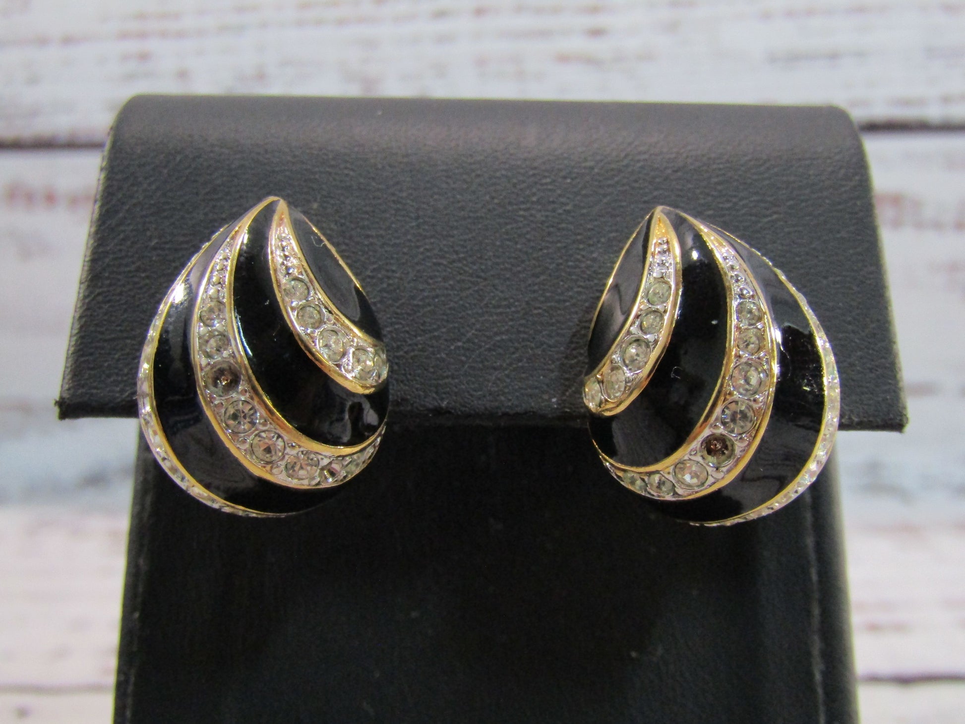 Vintage Nina Ricci Gold Plated Rhinestone Accent Black Enamel Clip-on Earrings