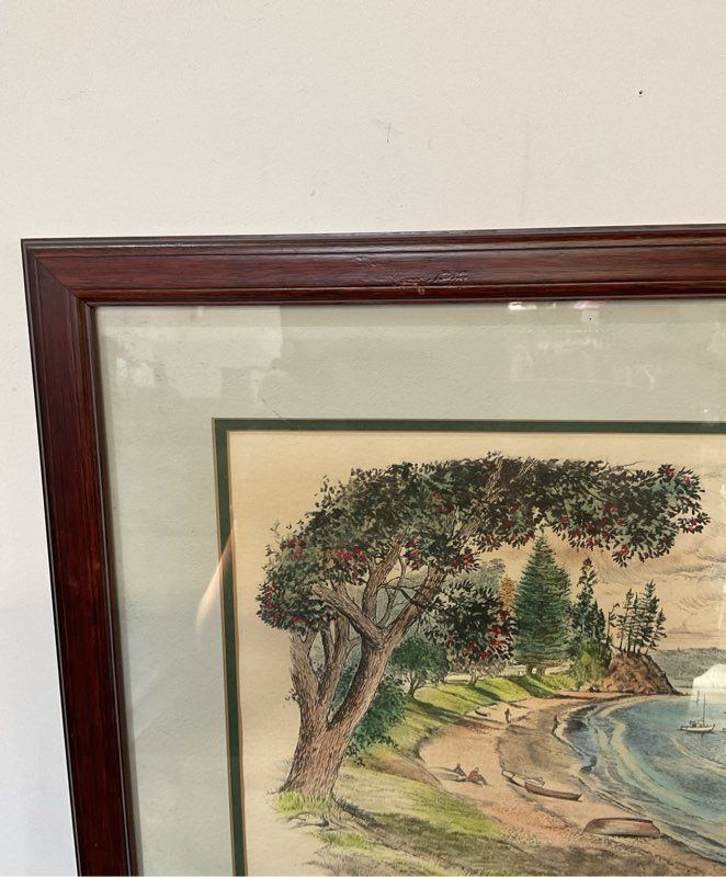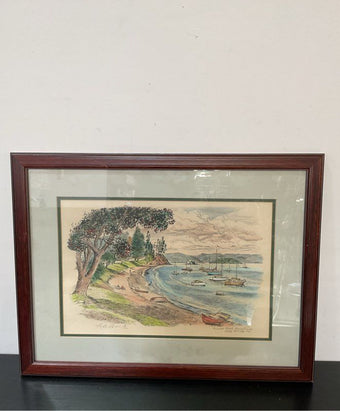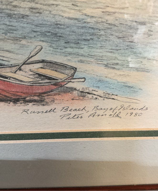 Description: Vintage Peter Arnold Russell Beach Bay of Islands 1980 Signed Print Signed. Matted & Framed