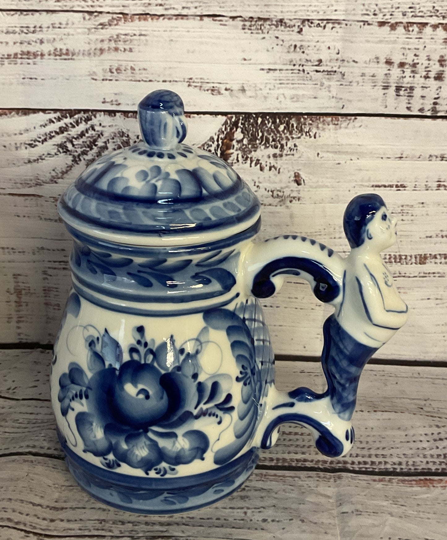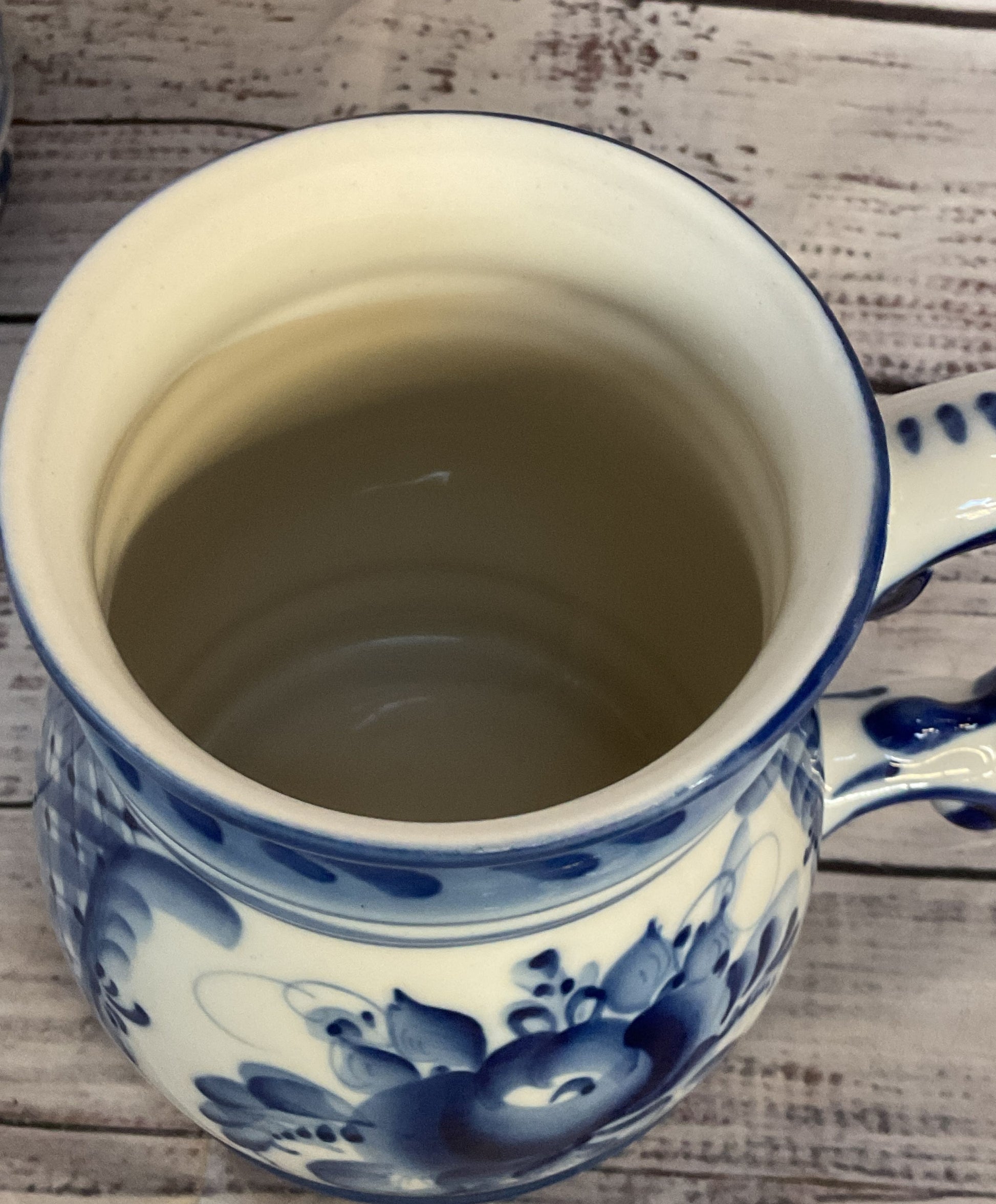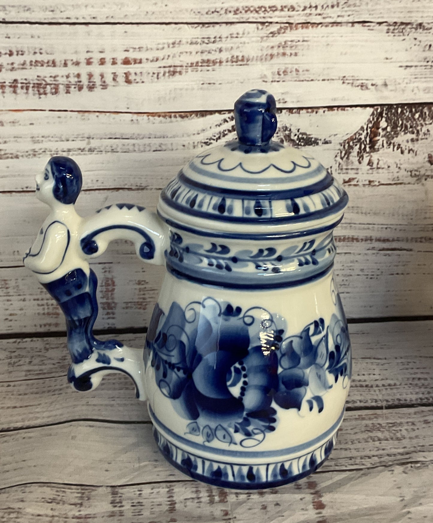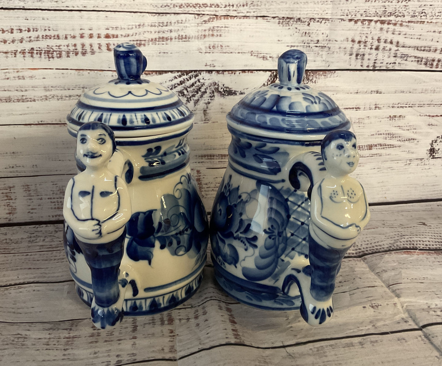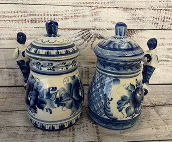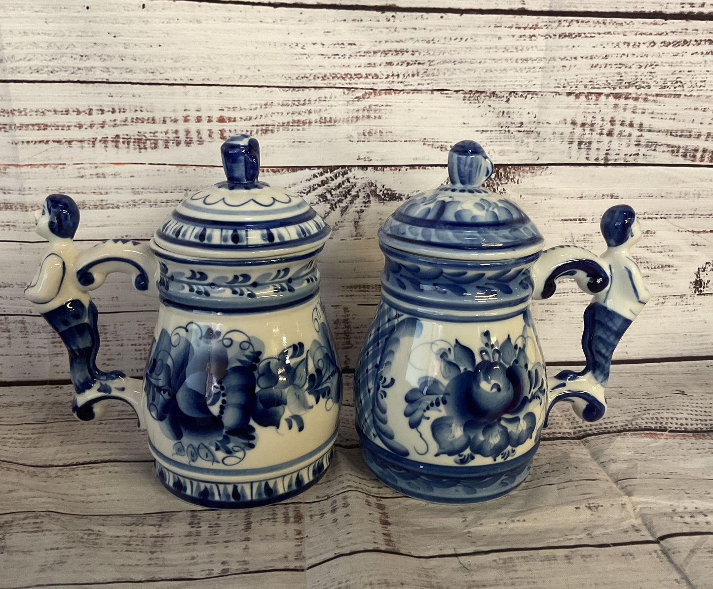 Vintage Russian Gzhel Porcelain Cobalt Lot of 2 Beer Mugs Blue White