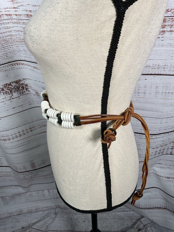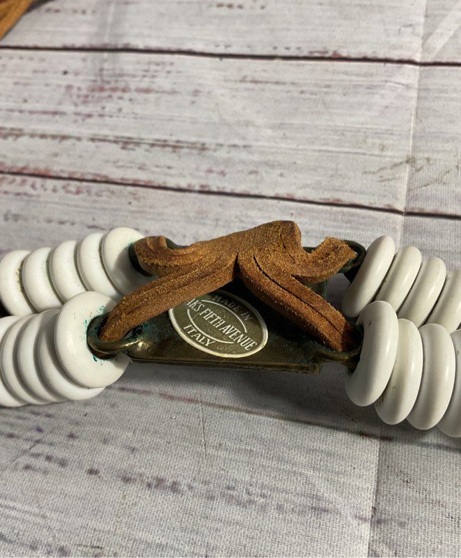 Vintage Saks Fifth Avenue White Beaded Square Buckle Leather Tie Belt