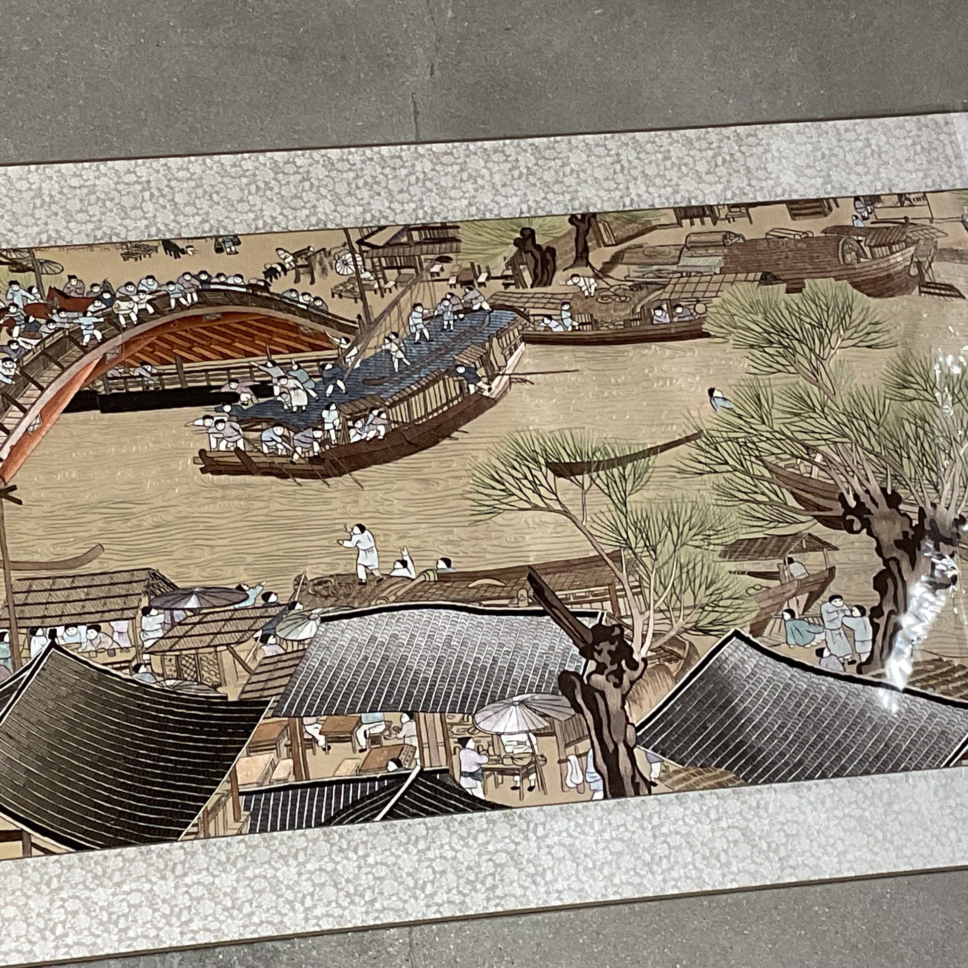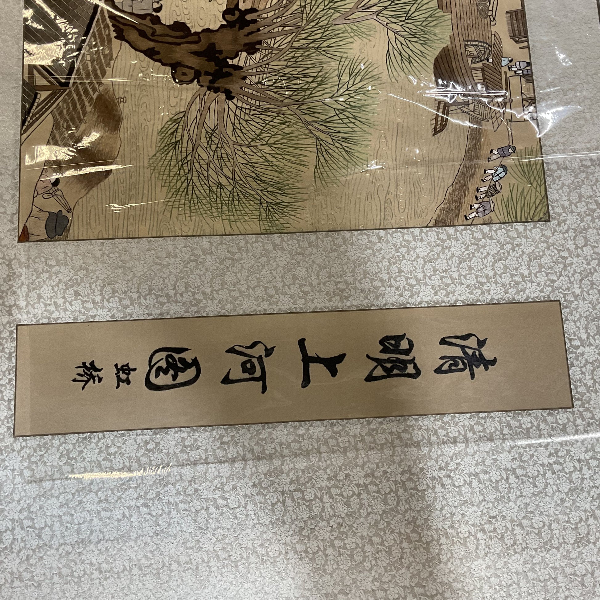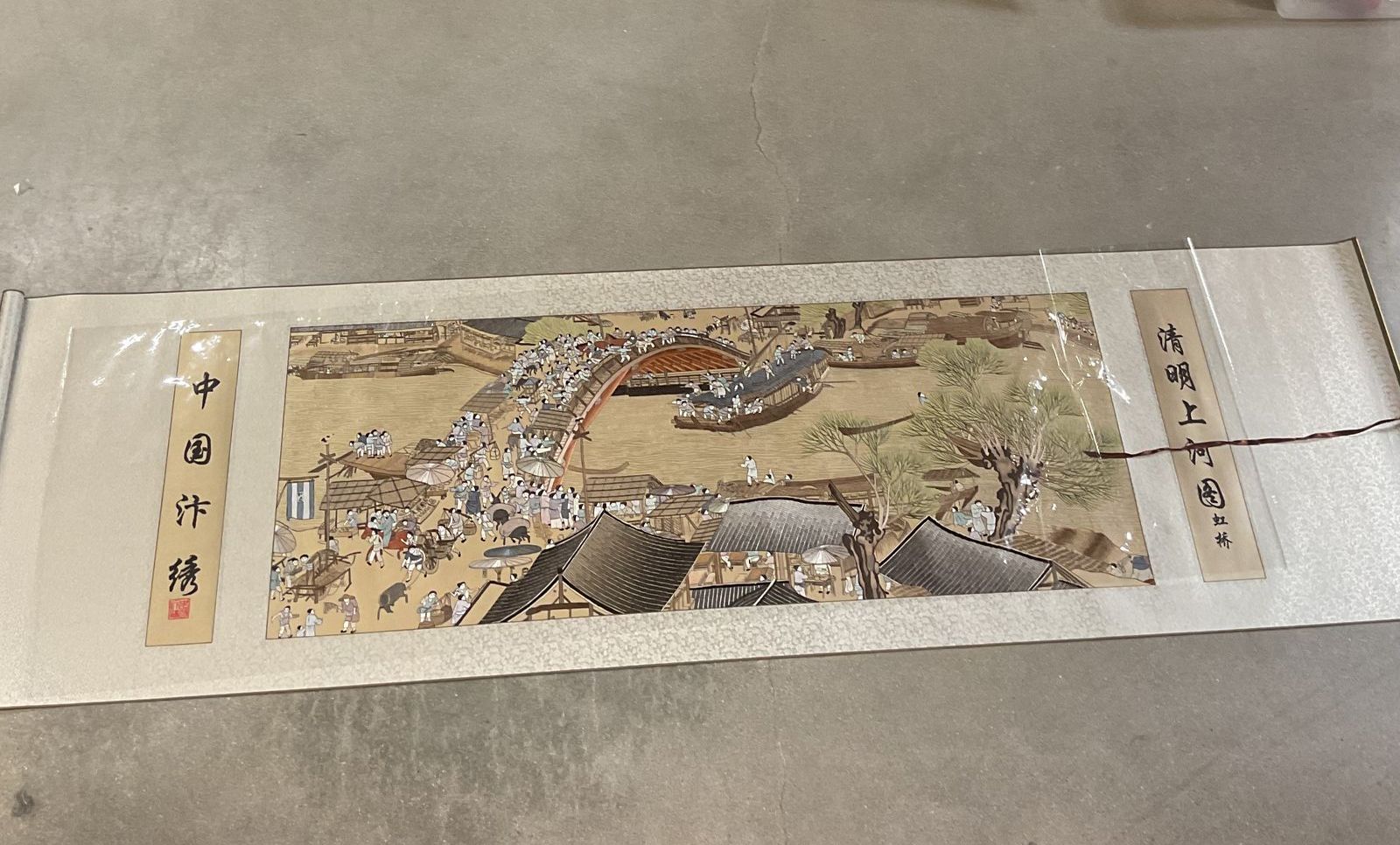 VTG. Asian Silk Embroidered Scroll with Wood Case and Dust Bag