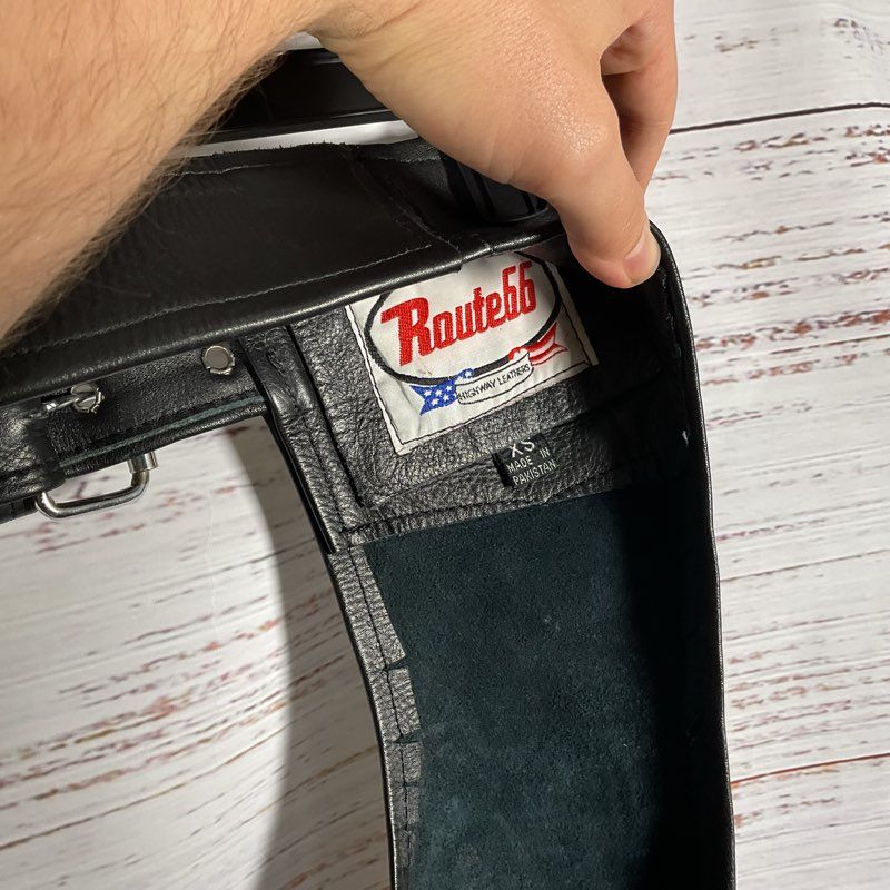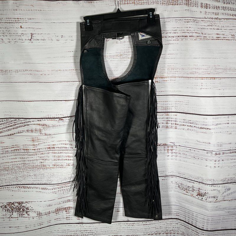 VTG. Route 66 Black Leather Tasseled Motorcycle Chaps Pants - Size XS