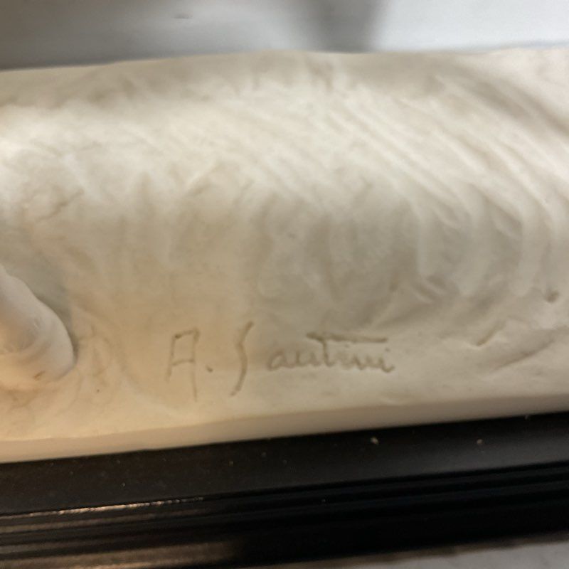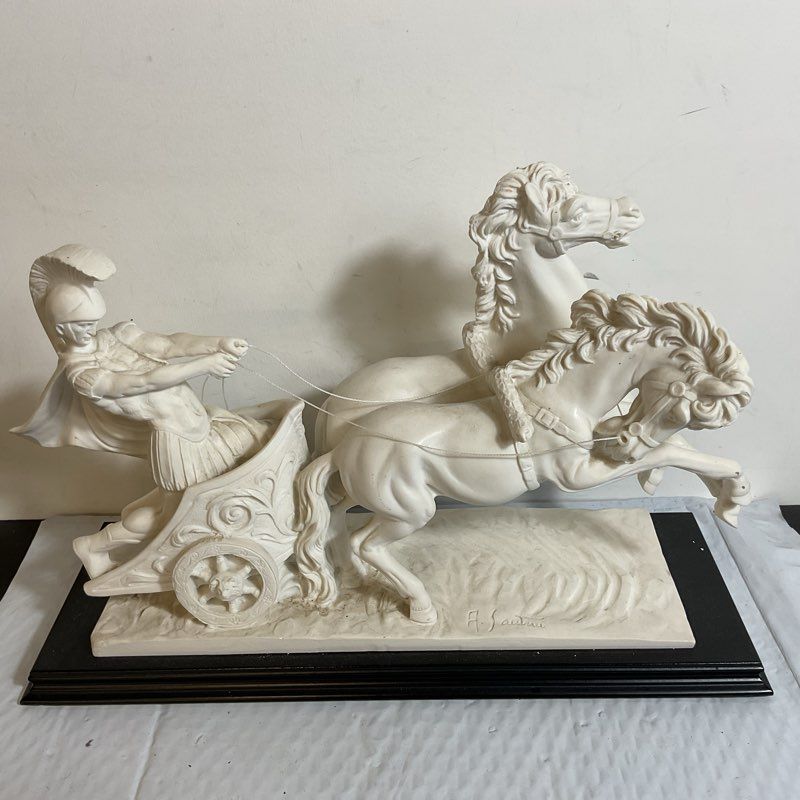 Description: VTG. Signed A. SANTINI Roman Chariot Gladiator Horses Sculpture STONE SCULPTURE Signed.