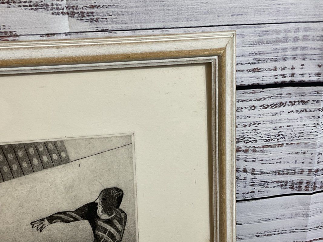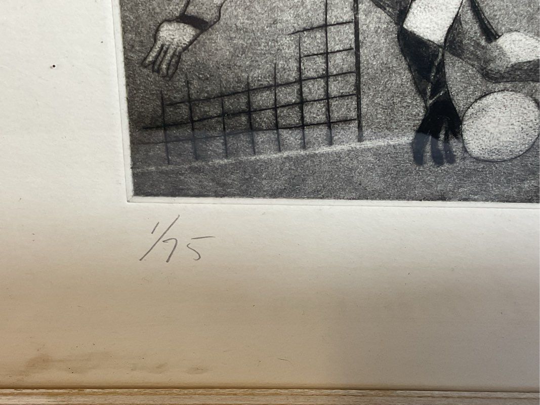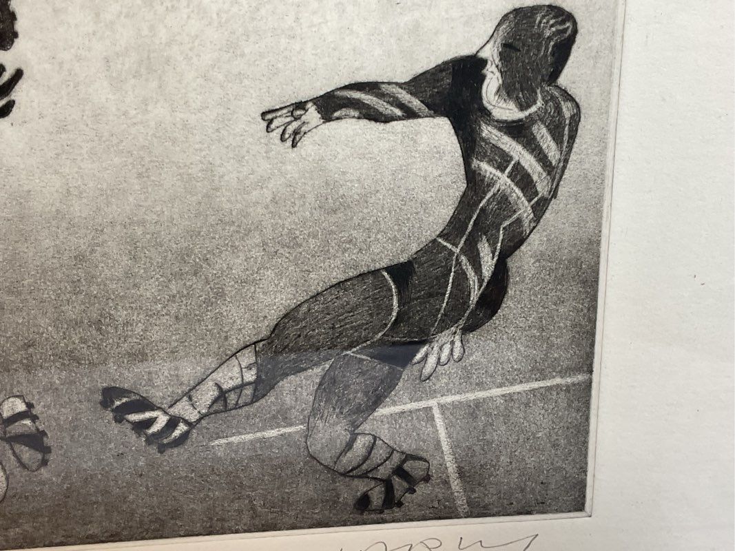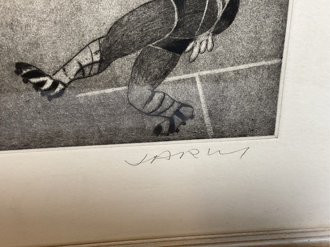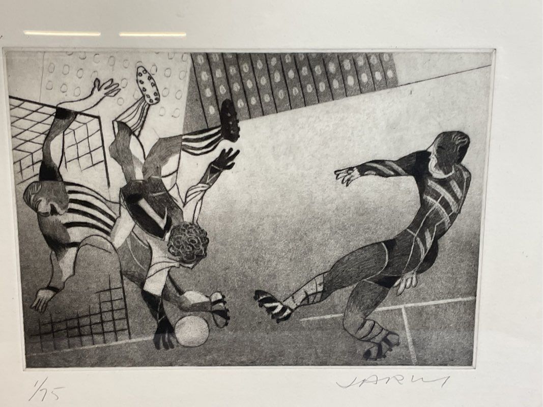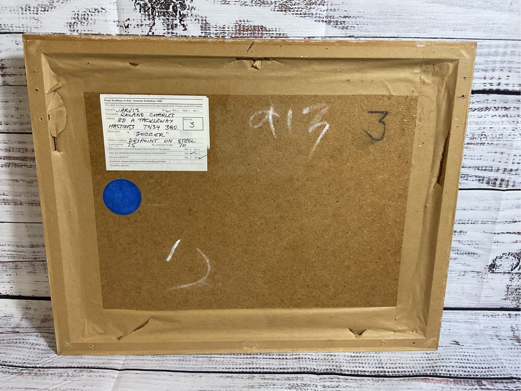 Description: VTG. Signed ROLAND JARVIS "Soccer" Drypoint on Steel Etching Print PRINT Signed. Framed