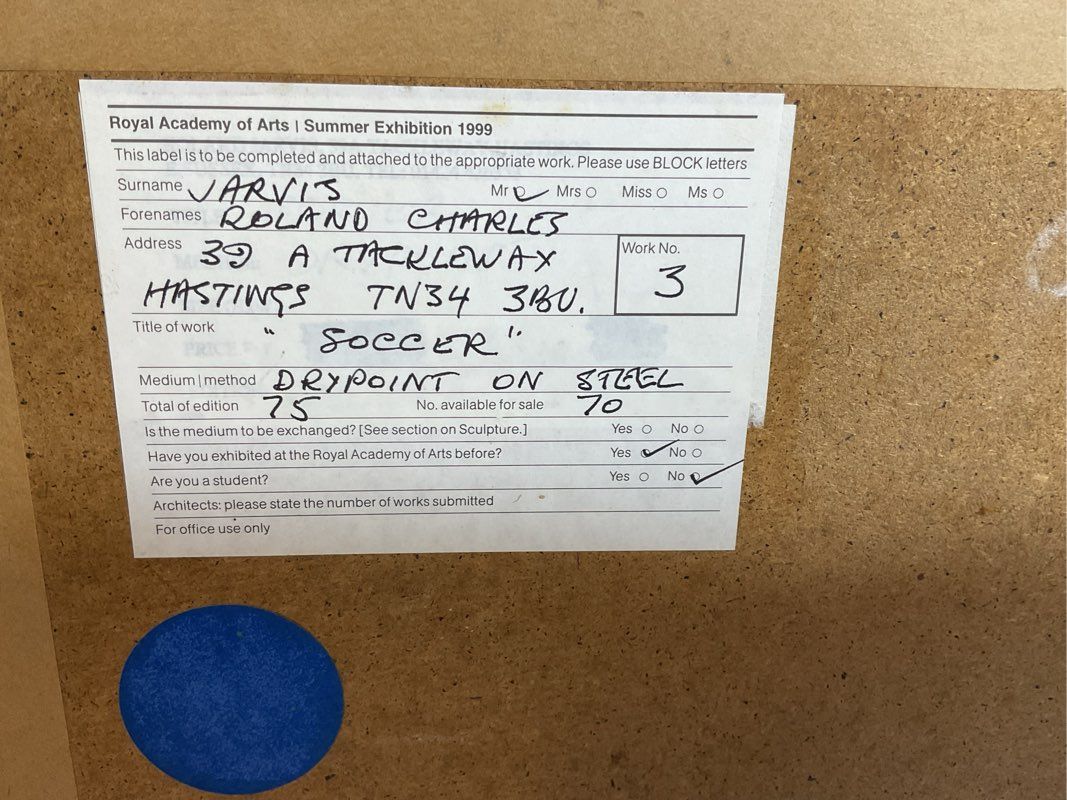VTG. Signed ROLAND JARVIS "Soccer" Drypoint on Steel Etching Print