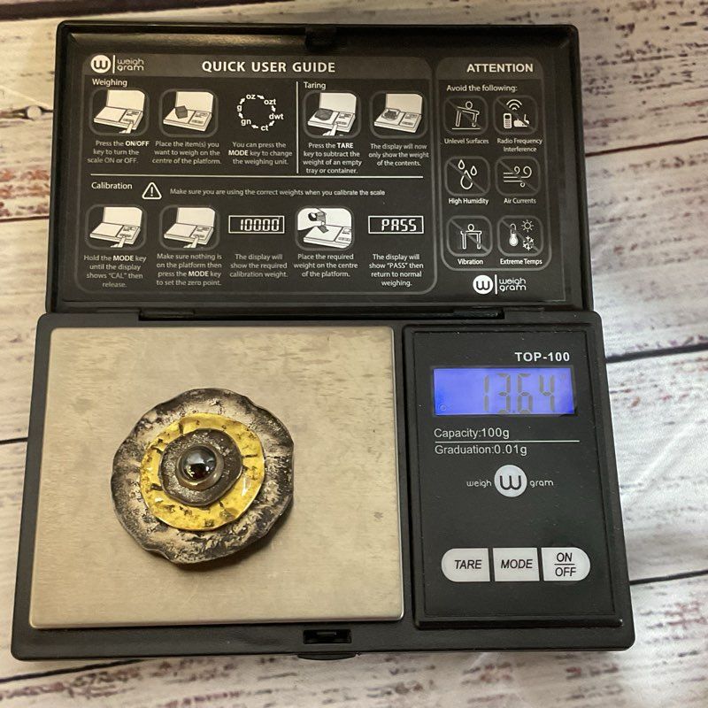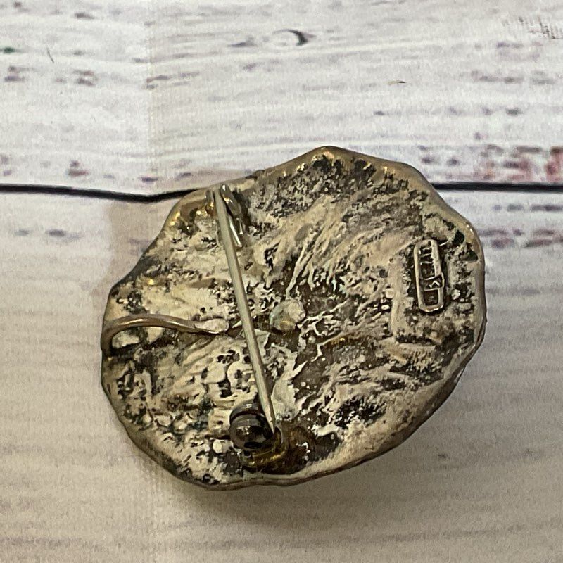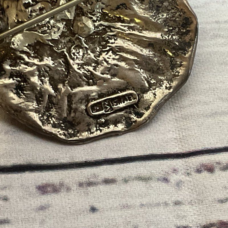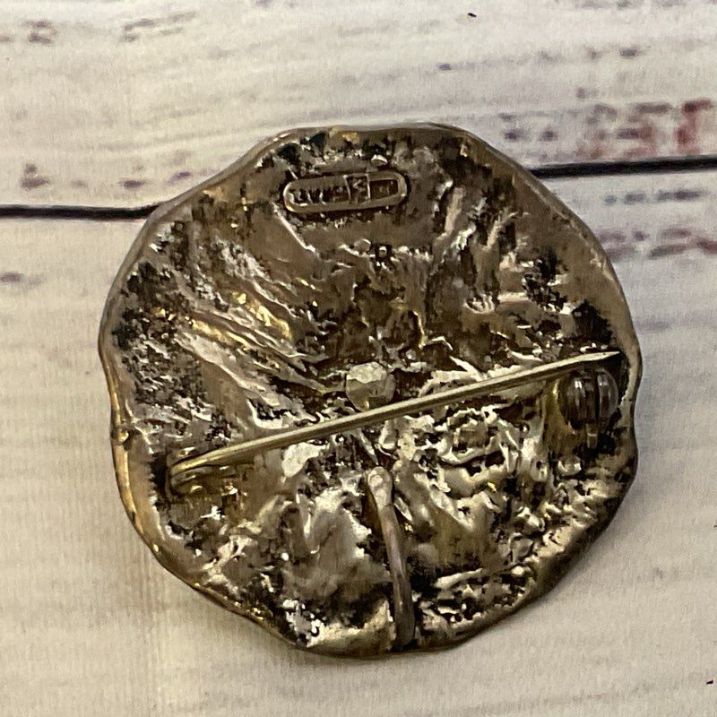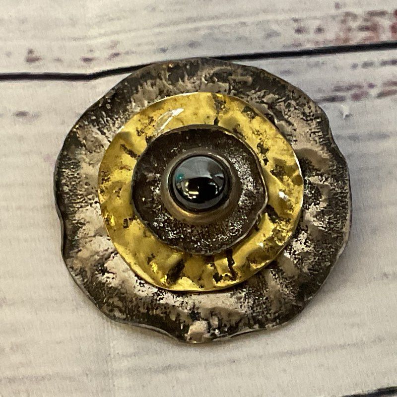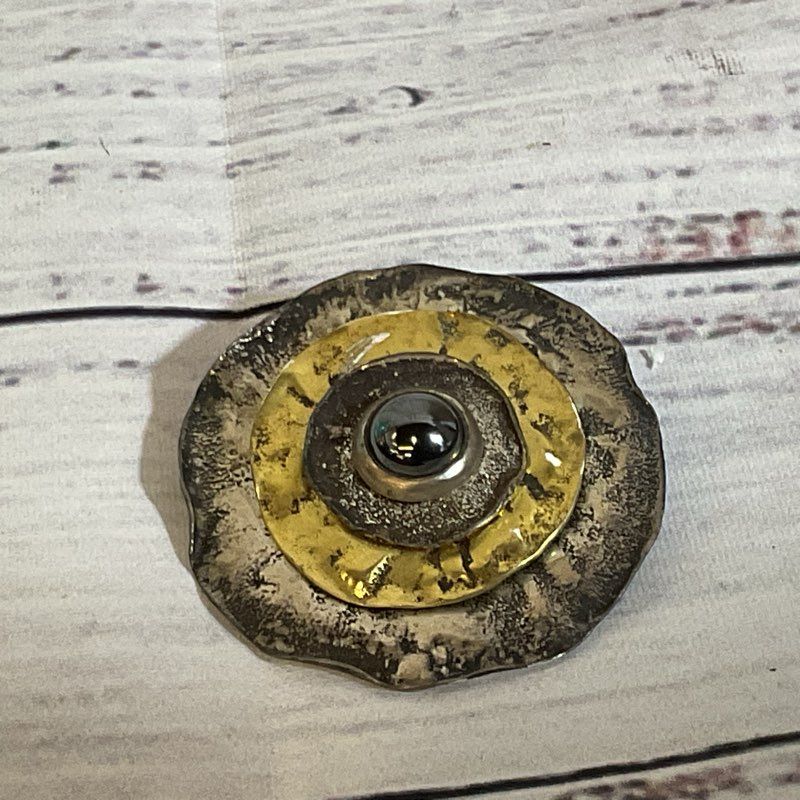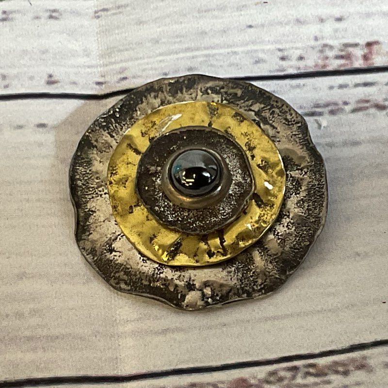 VTG. Sterling Silver Gold Tone Hematite Modernist Hammered Brooch- 1.5"