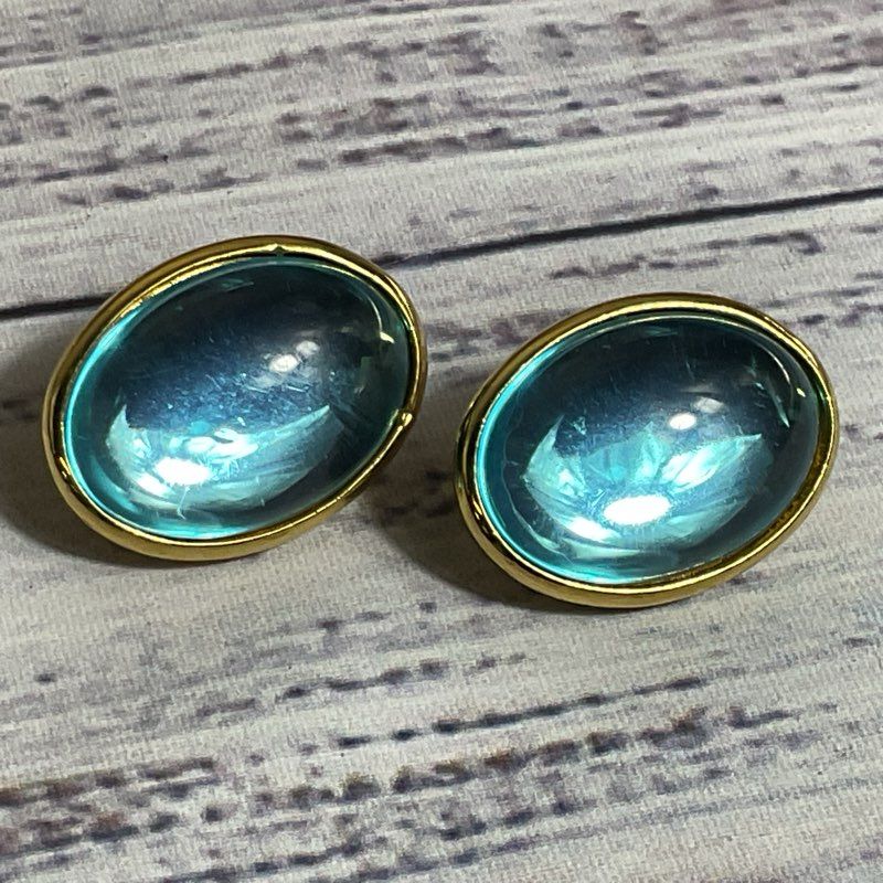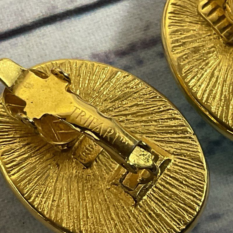 VTG. TRIFARI Gold Tone Blue Oval Rhinestone Clip On Earrings- 1.25"