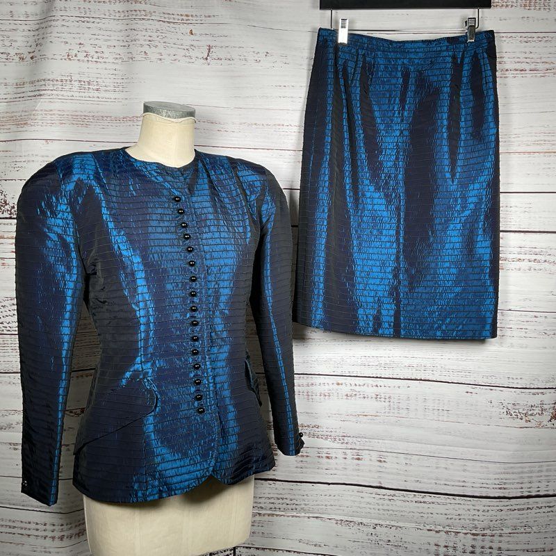 VTG. VICTOR COSTA Women's Satin Blue Skirt Suit- SZ 14